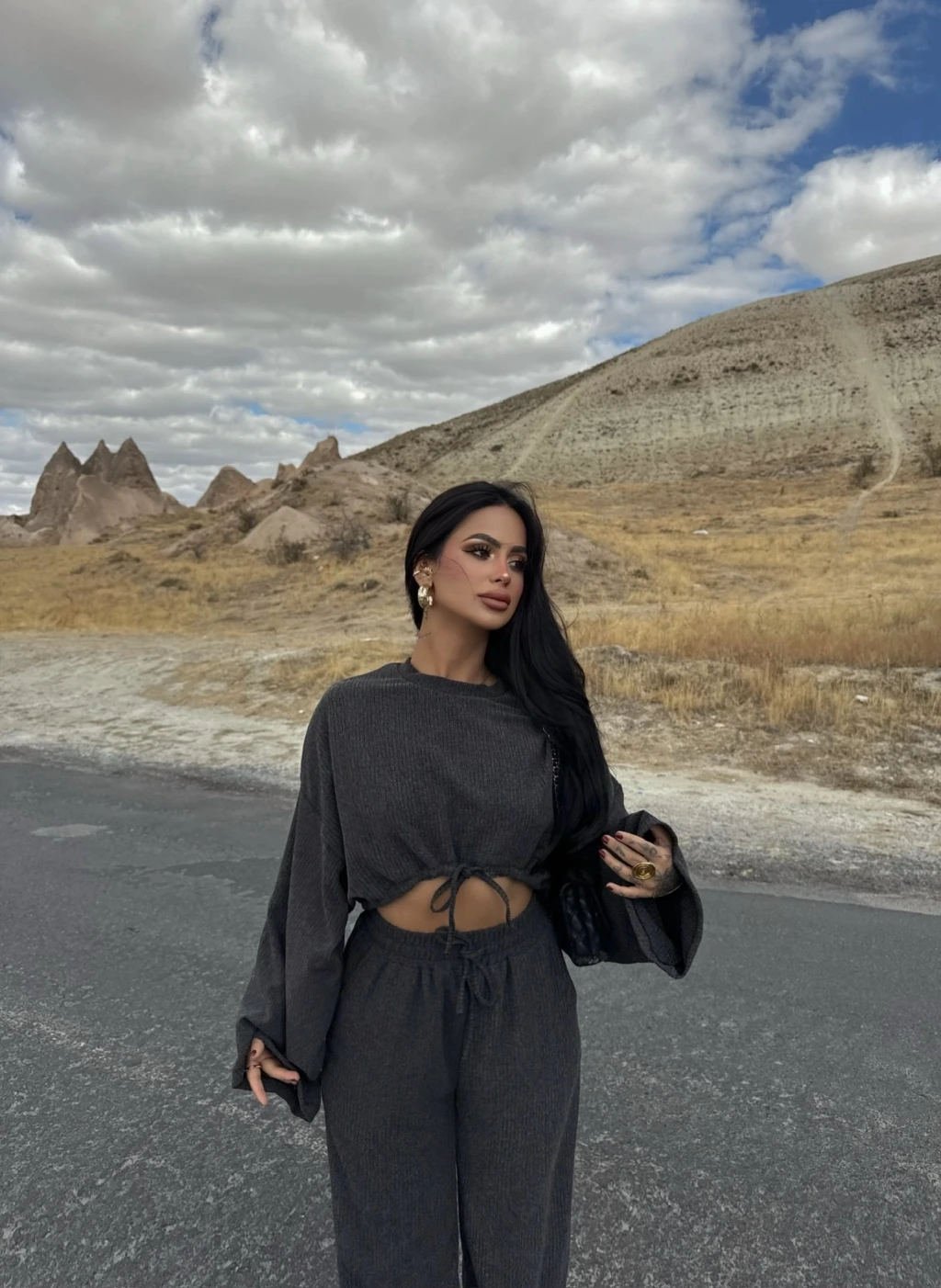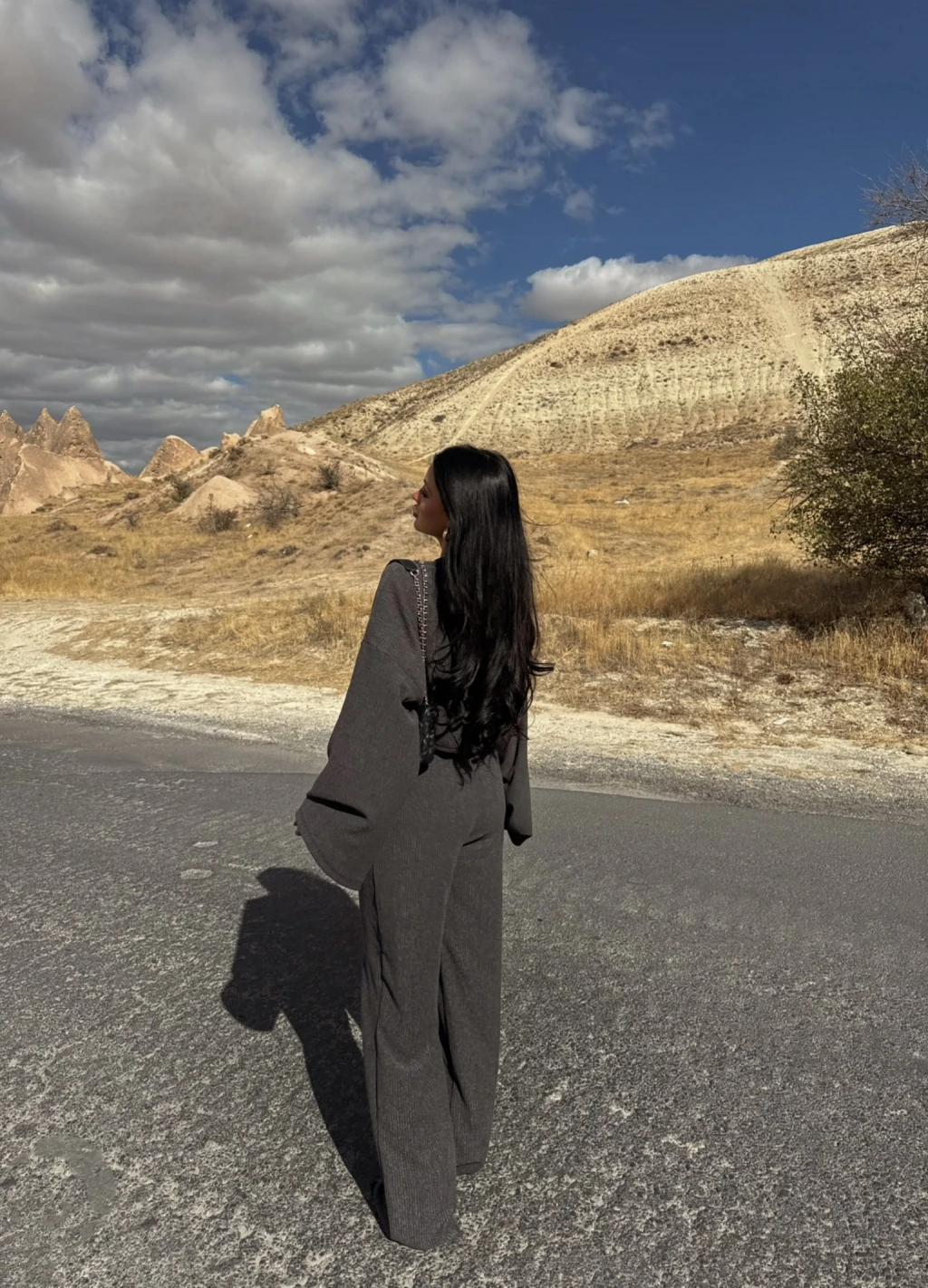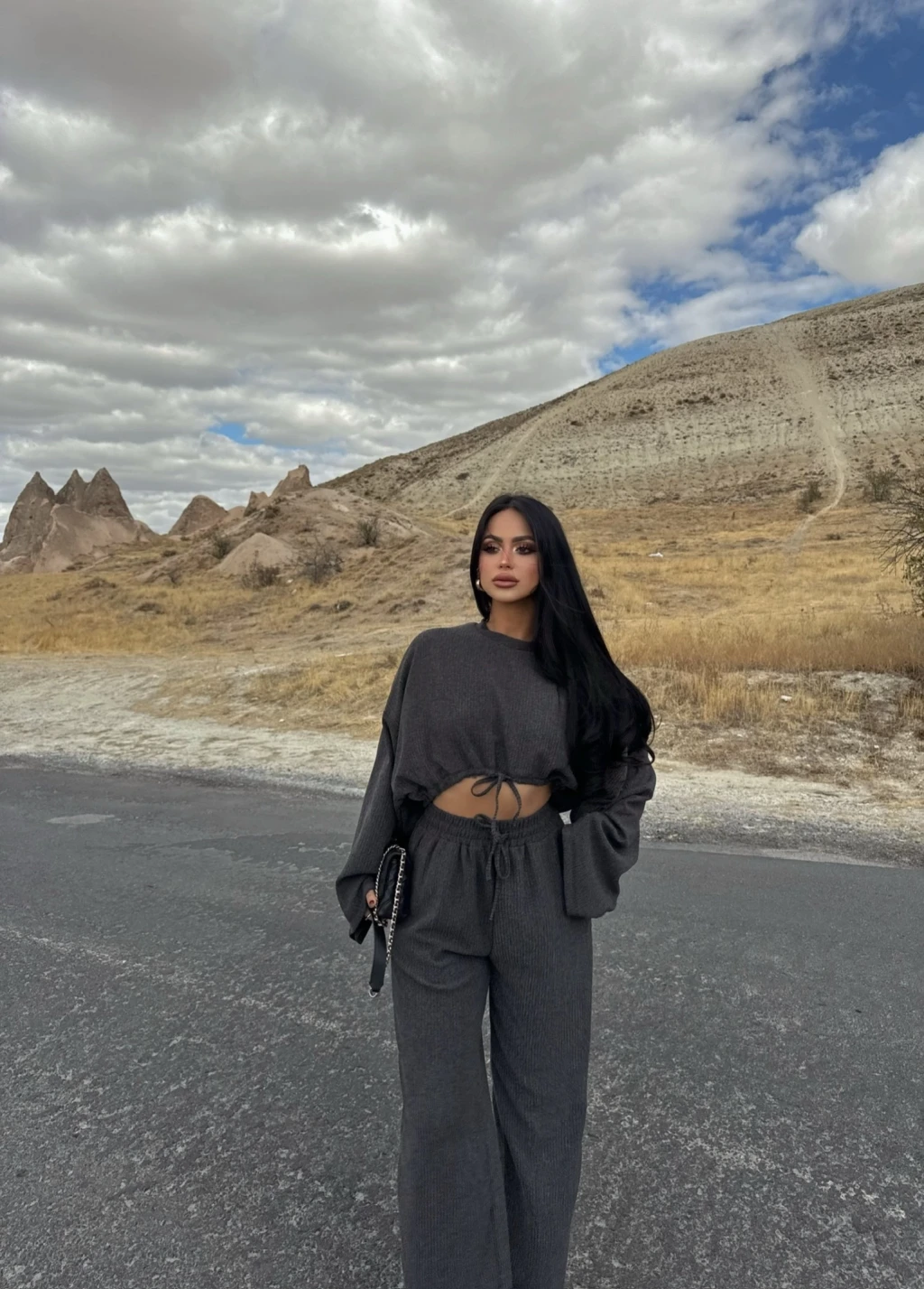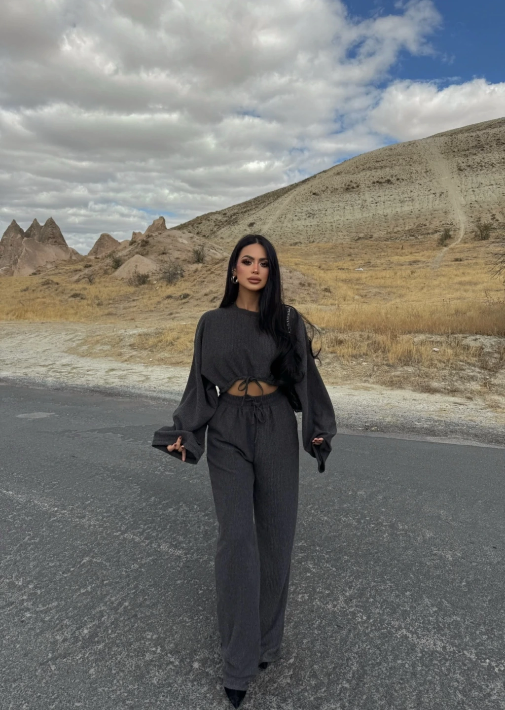 Özel tasarım balon kollu bluzun modern detayları, takımın şıklığını ön plana çıkarıyor.
