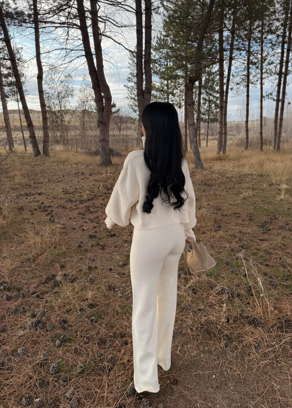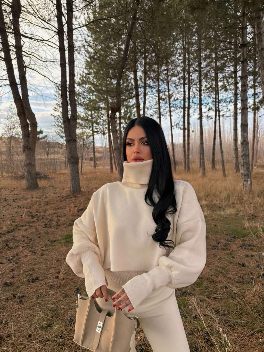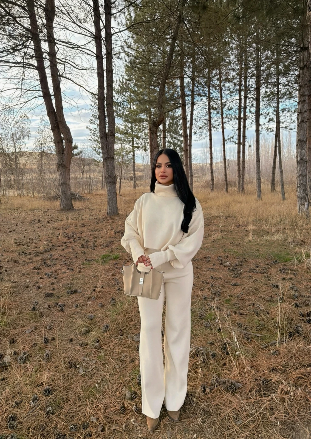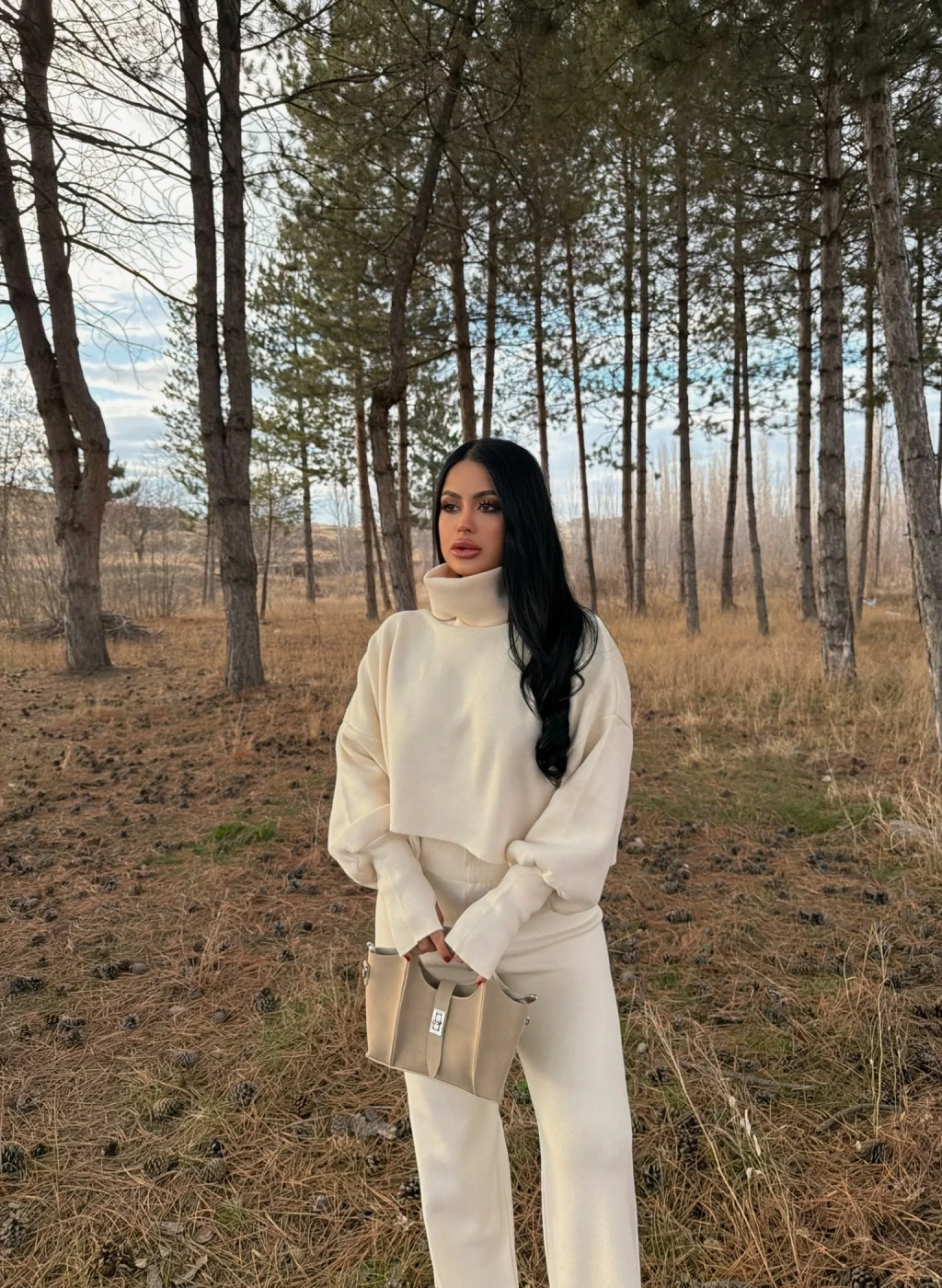 Bej Boğazlı Kazak Pantolon Triko Takım