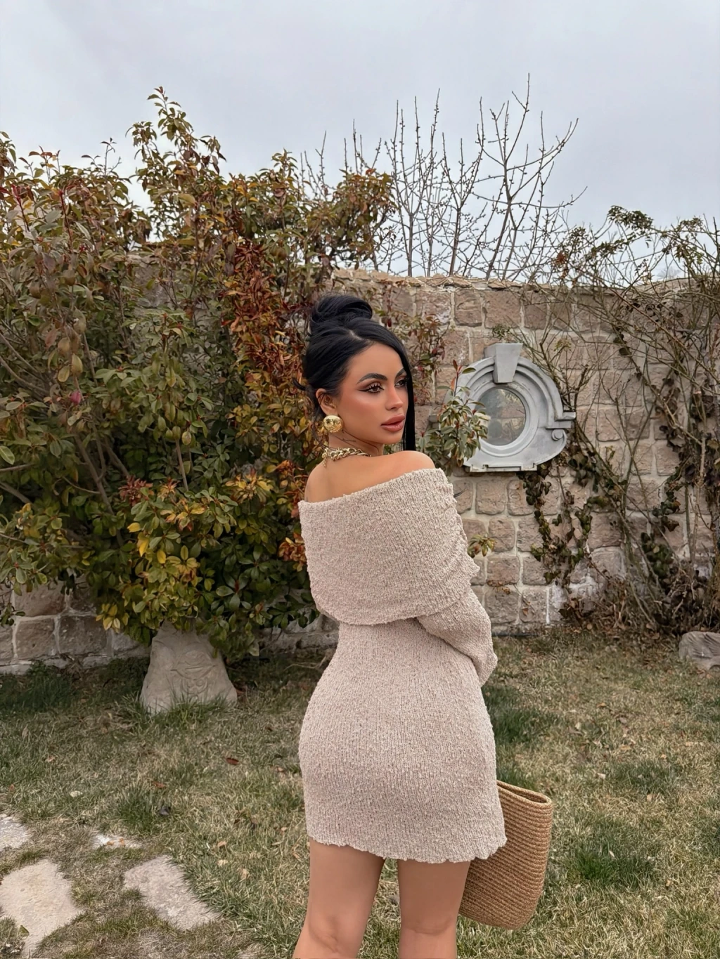 Bej Katlamalı Triko Madonna Elbise