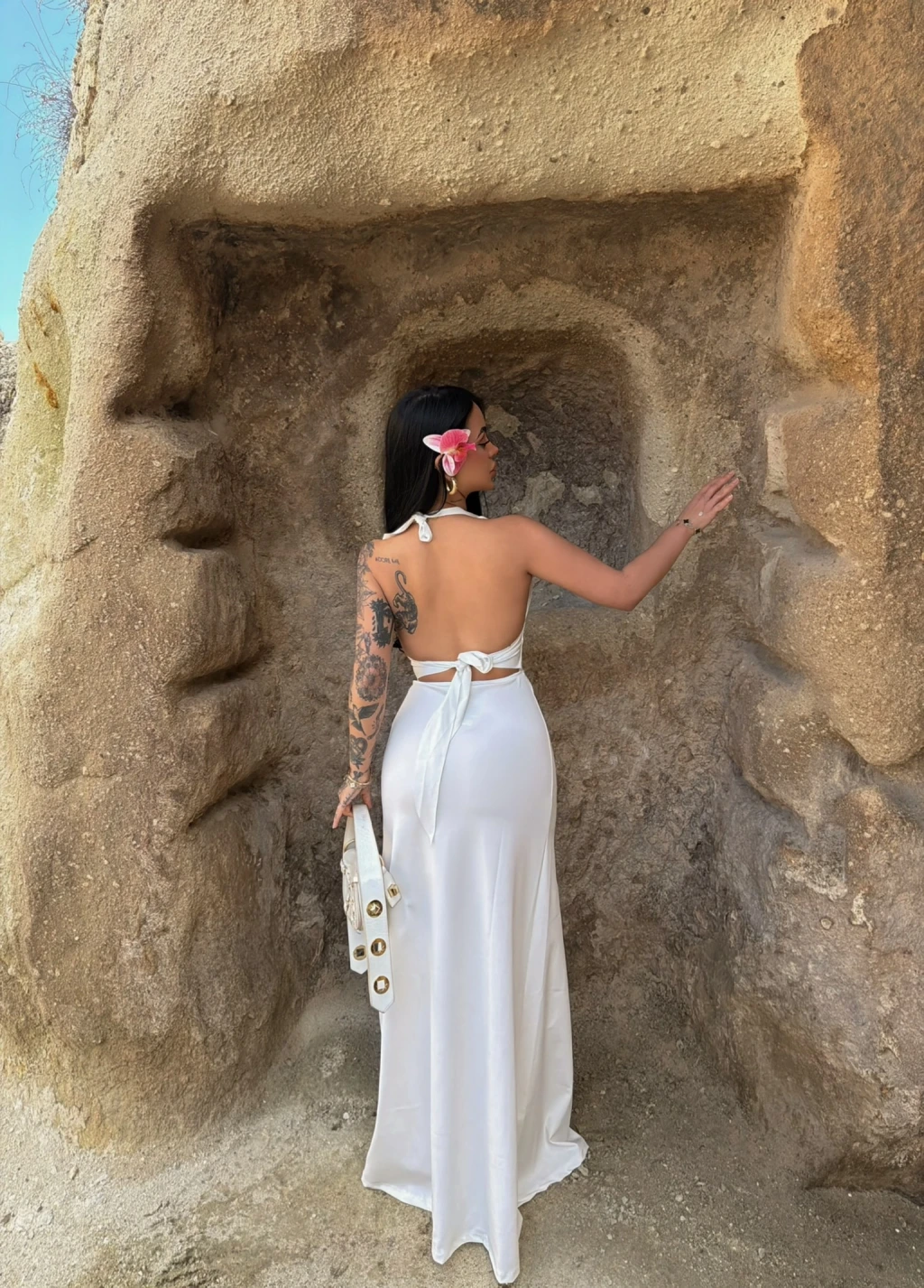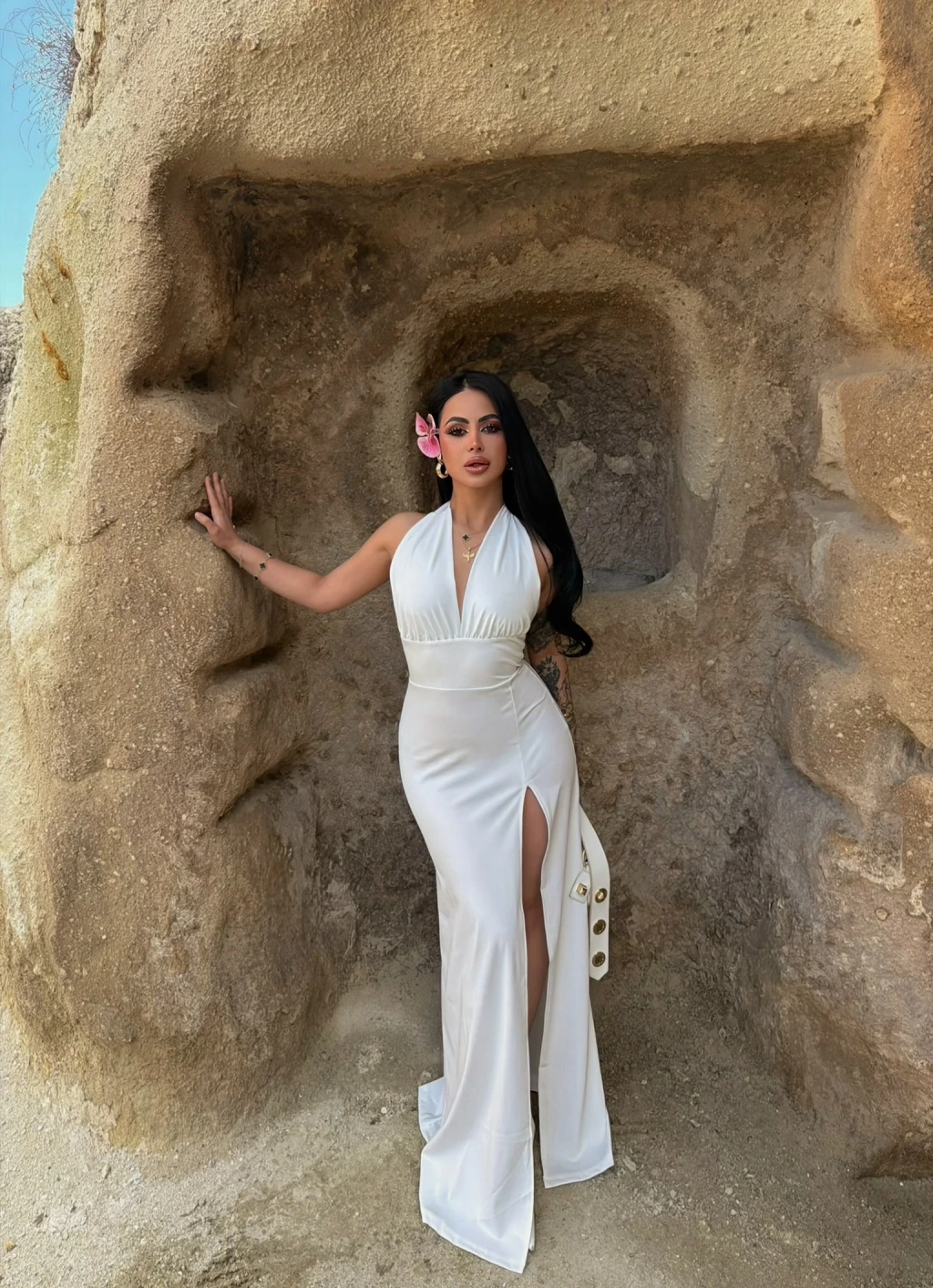 Beyaz Boyundan Geçmeli Yırtmaçlı Elbise
