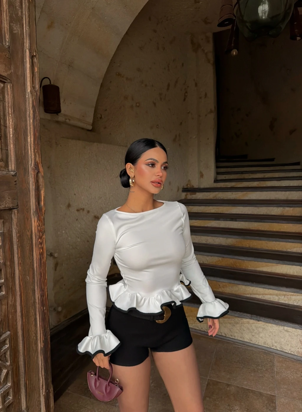 • Omuz kısmında ve etek ucunda bulunan fırfır detaylarıyla dikkat çeker.