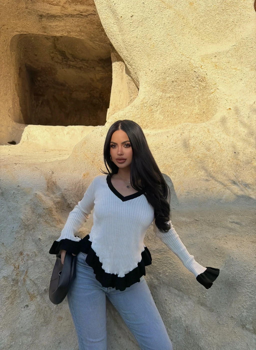 Kırmızı Butik'in Fırfırlı Fitilli Kazak modeli ile şıklığı ve rahatlığı bir arada bulacaksınız.