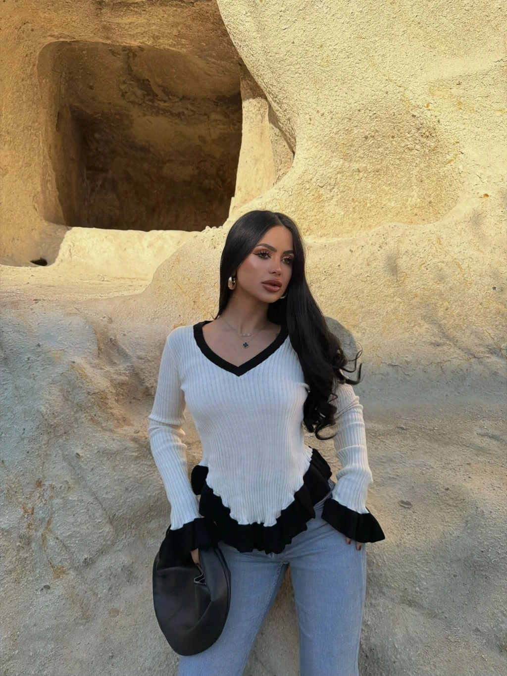 Şıklığı ve rahatlığı bir arada arayanların tercihi olan Fırfırlı Fitilli Kazak, günlük hayatta ve özel günlerde şık ve şık bir seçenektir.
