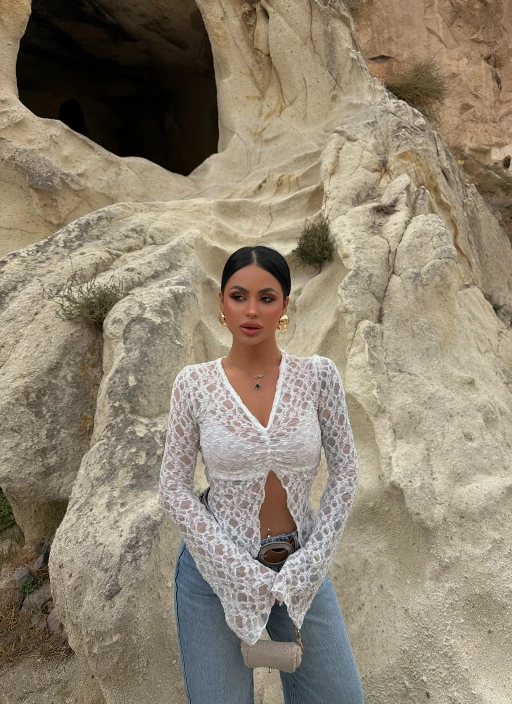 Ön büzgülü güpürlü bluzu şık bir etek veya pantolon ile kombinleyerek günlük hayatta veya özel davetlerde rahatlıkla kullanabilirsiniz.