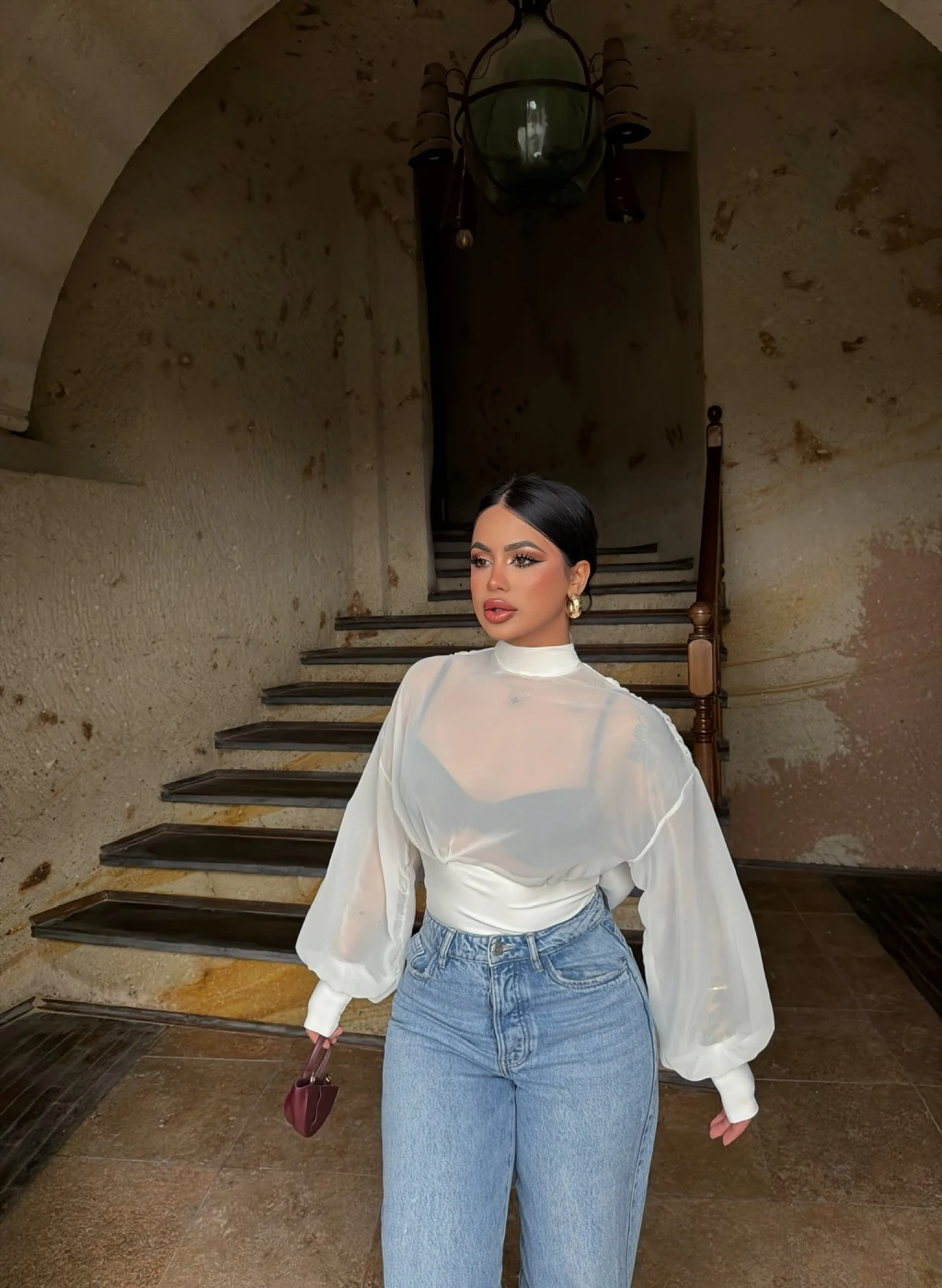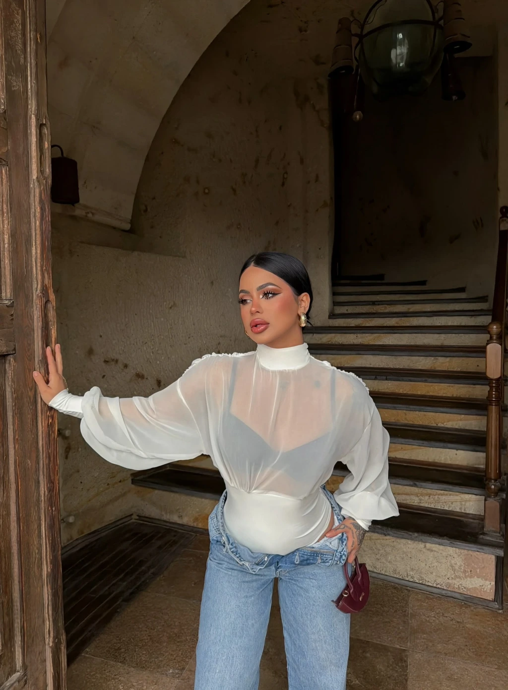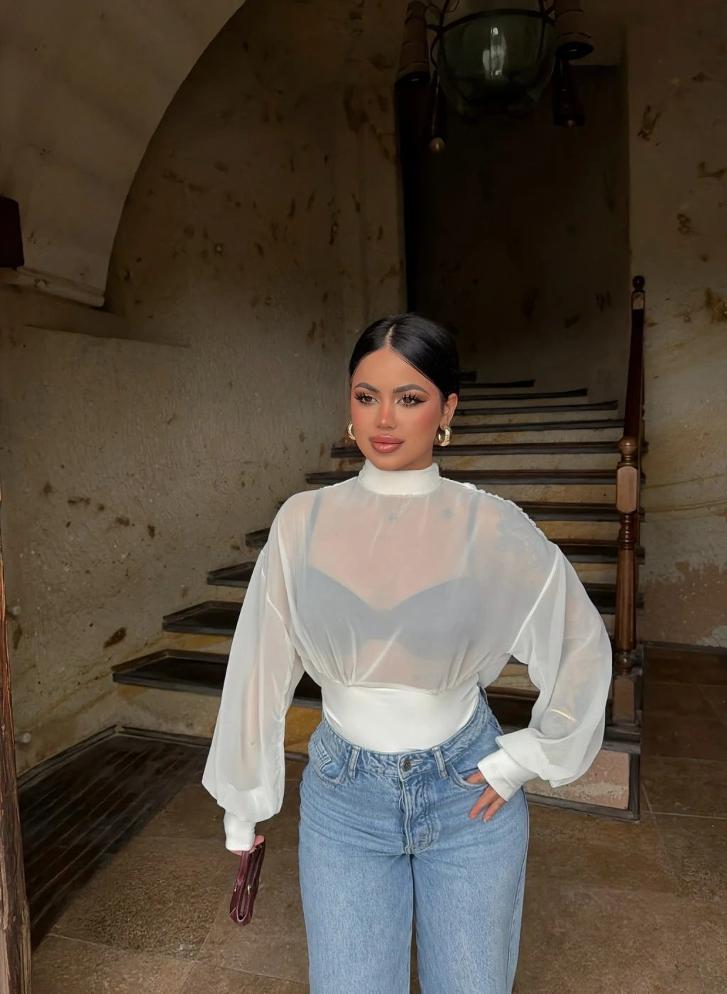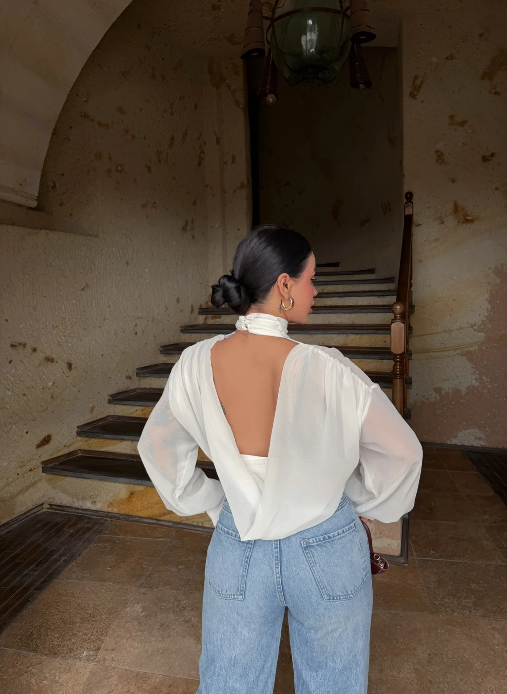 Sırt Degaje Tül Şifon Bodysuit, şıklığı ve feminenliği bir arada sunan Kırmızı Butik'in özel tasarımıdır.