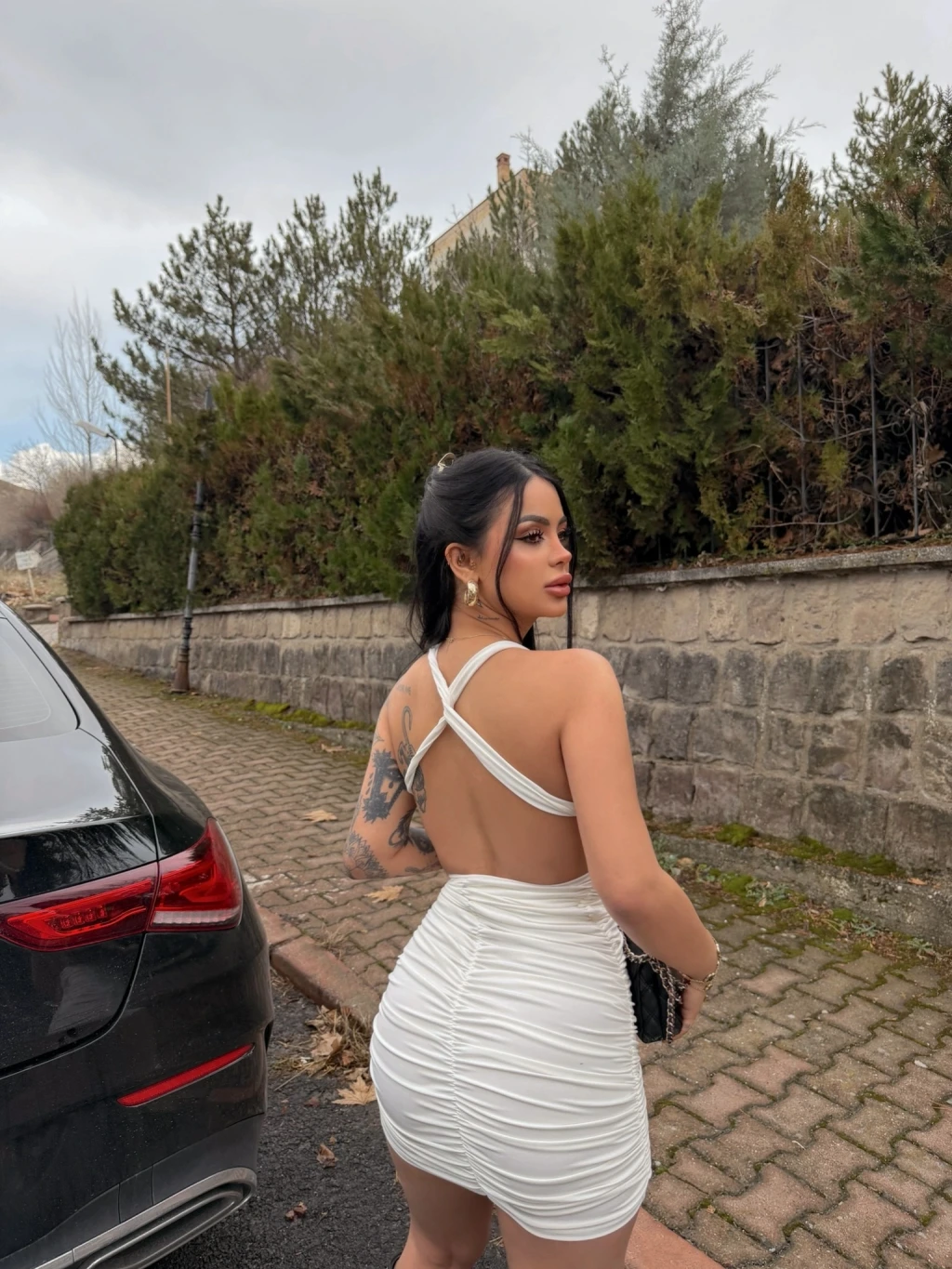Beyaz Tokalı Sırt Çapraz Büzgülü Elbise