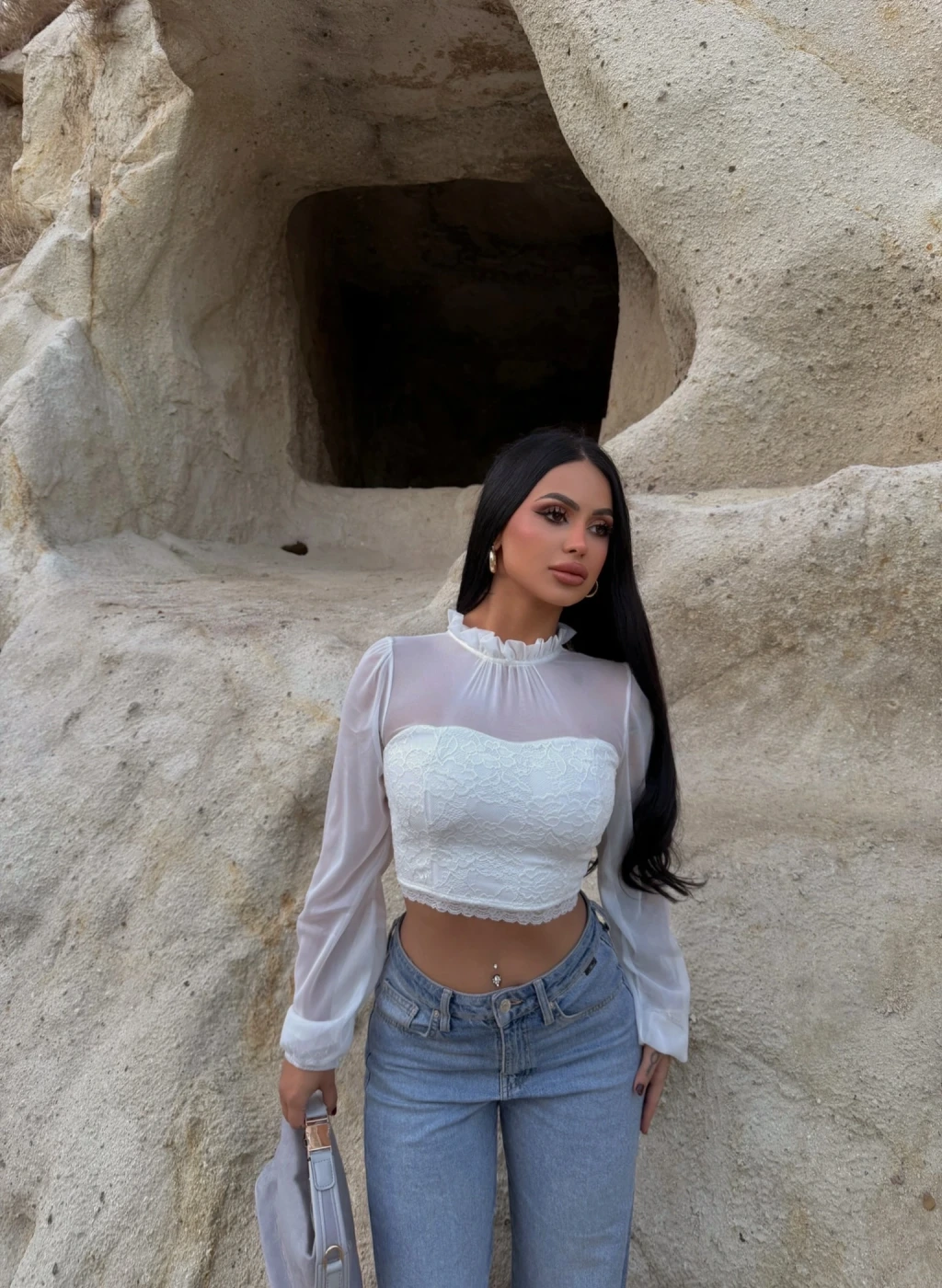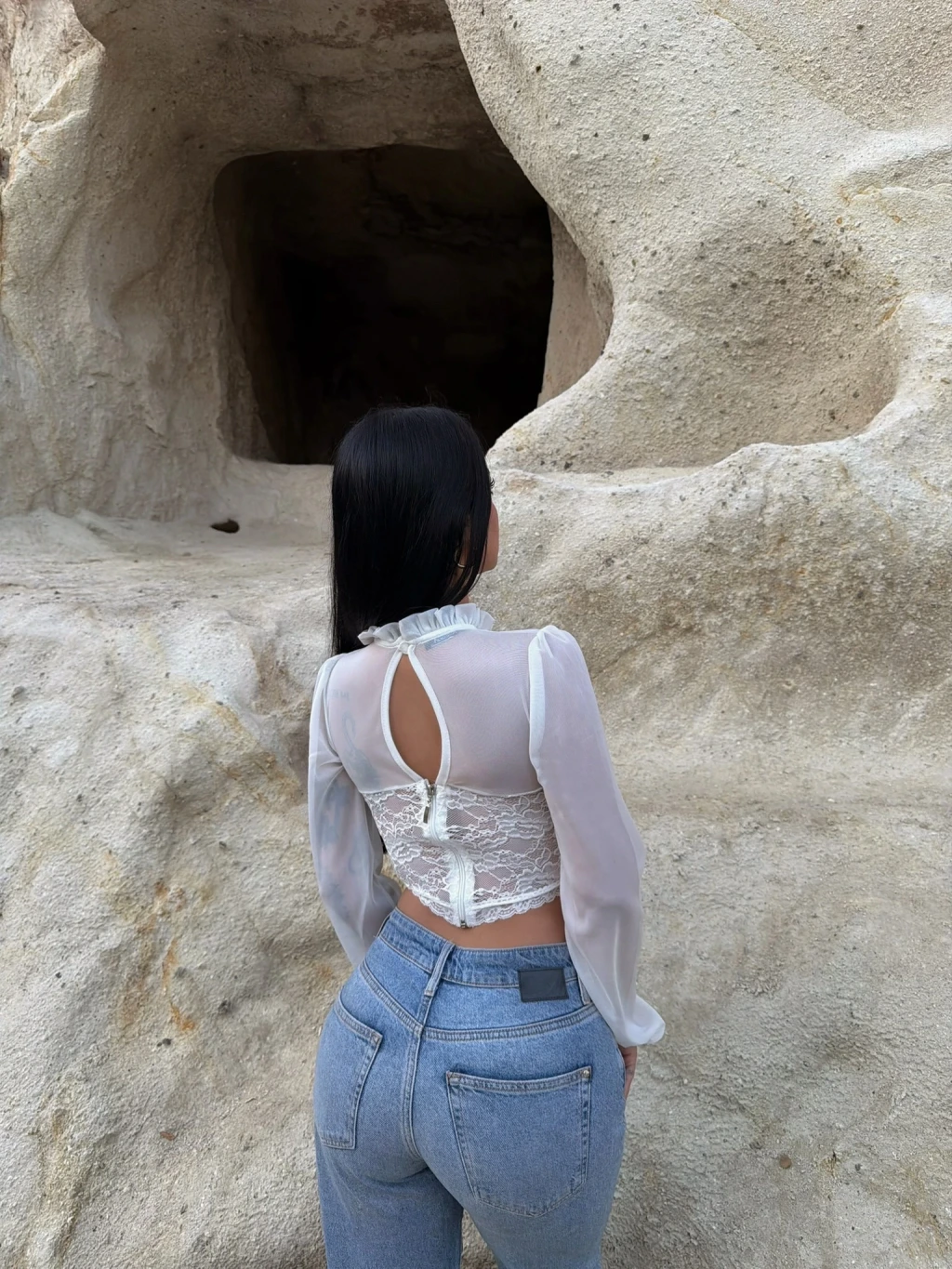 Kırmızı Butik'in özel tasarımı Tül Detaylı Güpürlü Bluz, şıklığı ve zarafeti bir arada sunuyor.