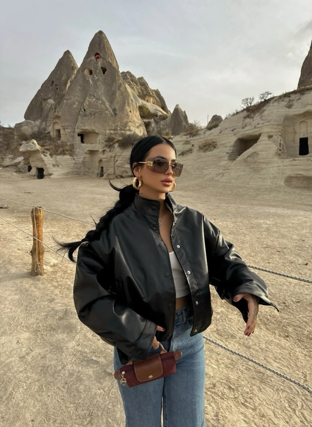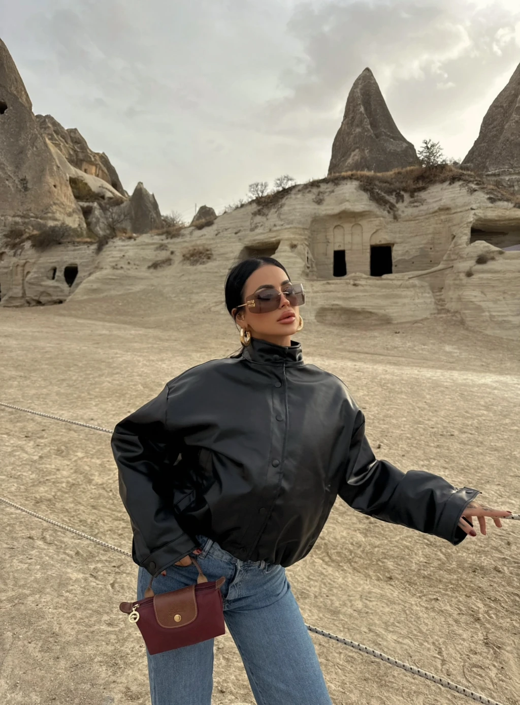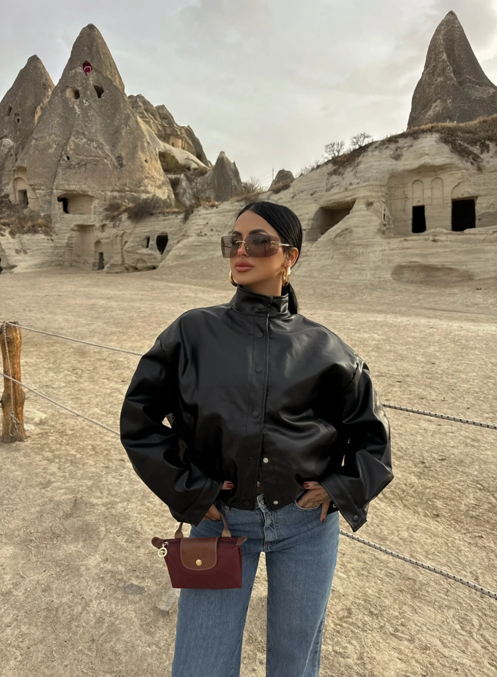 Blkout Suni Deri Ceket, şıklığı ve rahatlığı bir arada sunan Kırmızı Butik'in öne çıkan bir tasarımıdır.