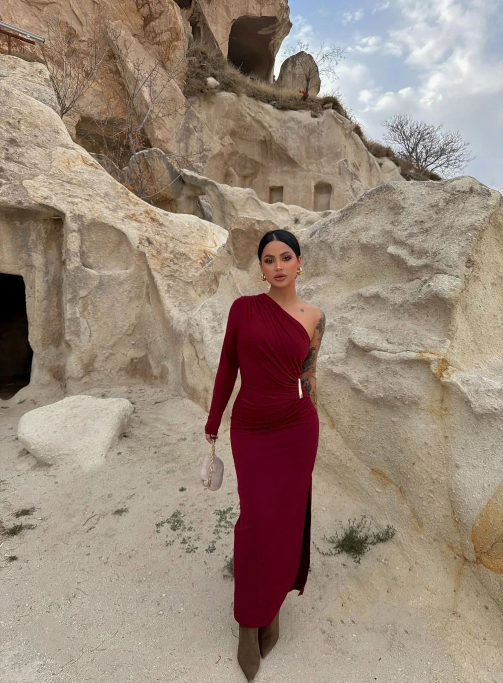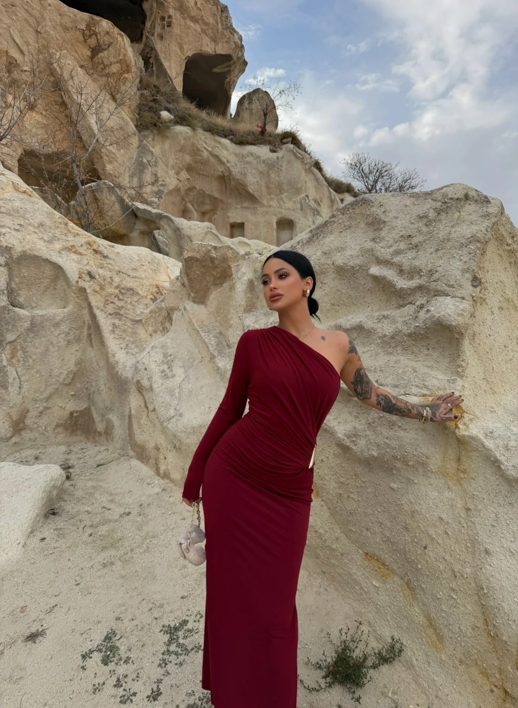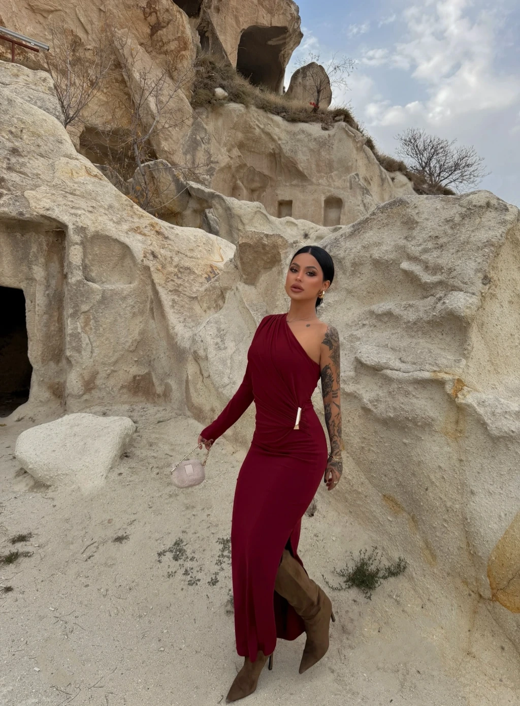Bordo Omuz Drapeli Aksesuarlı Elbise