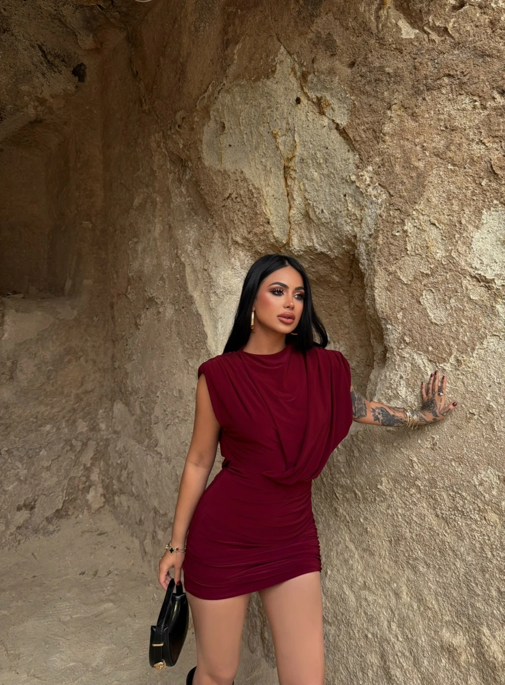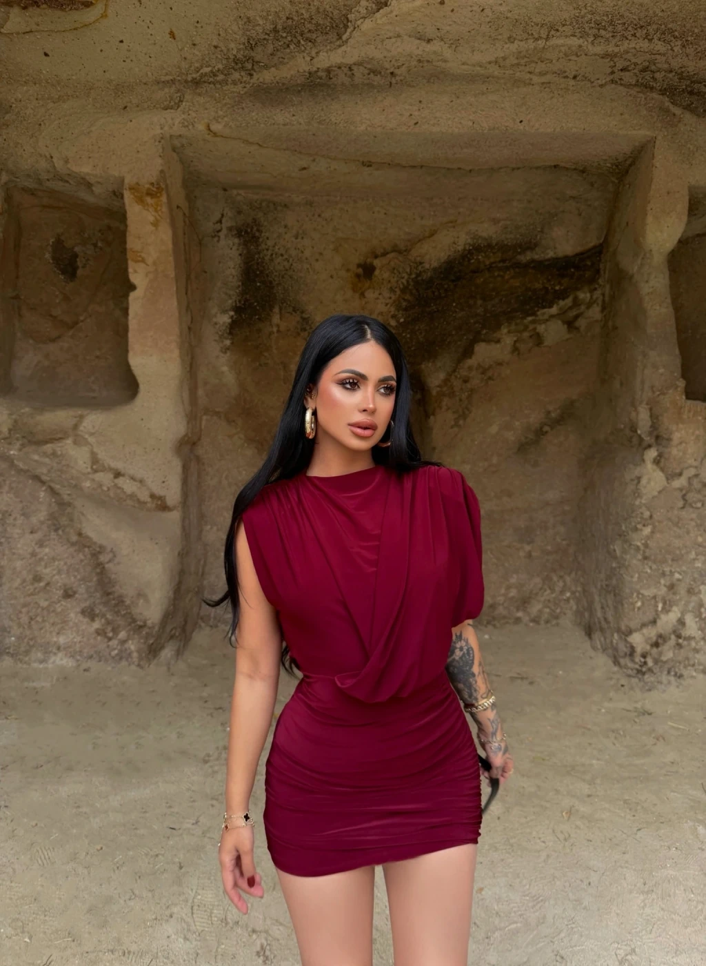 Bordo Omuz Vatkalı Büzgülü Sandy Elbise