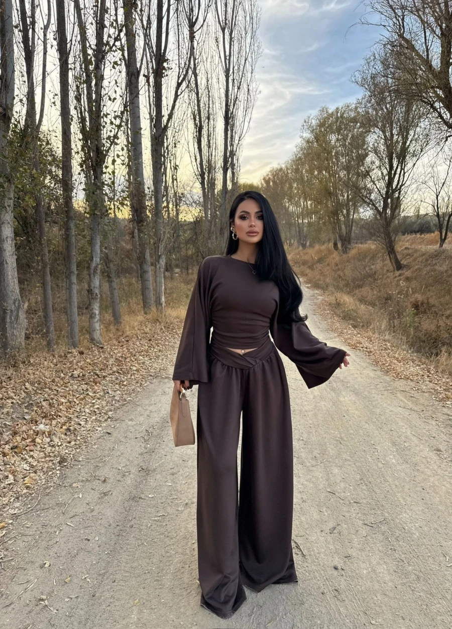Kahve Kolları Volanlı Korseli Bluz