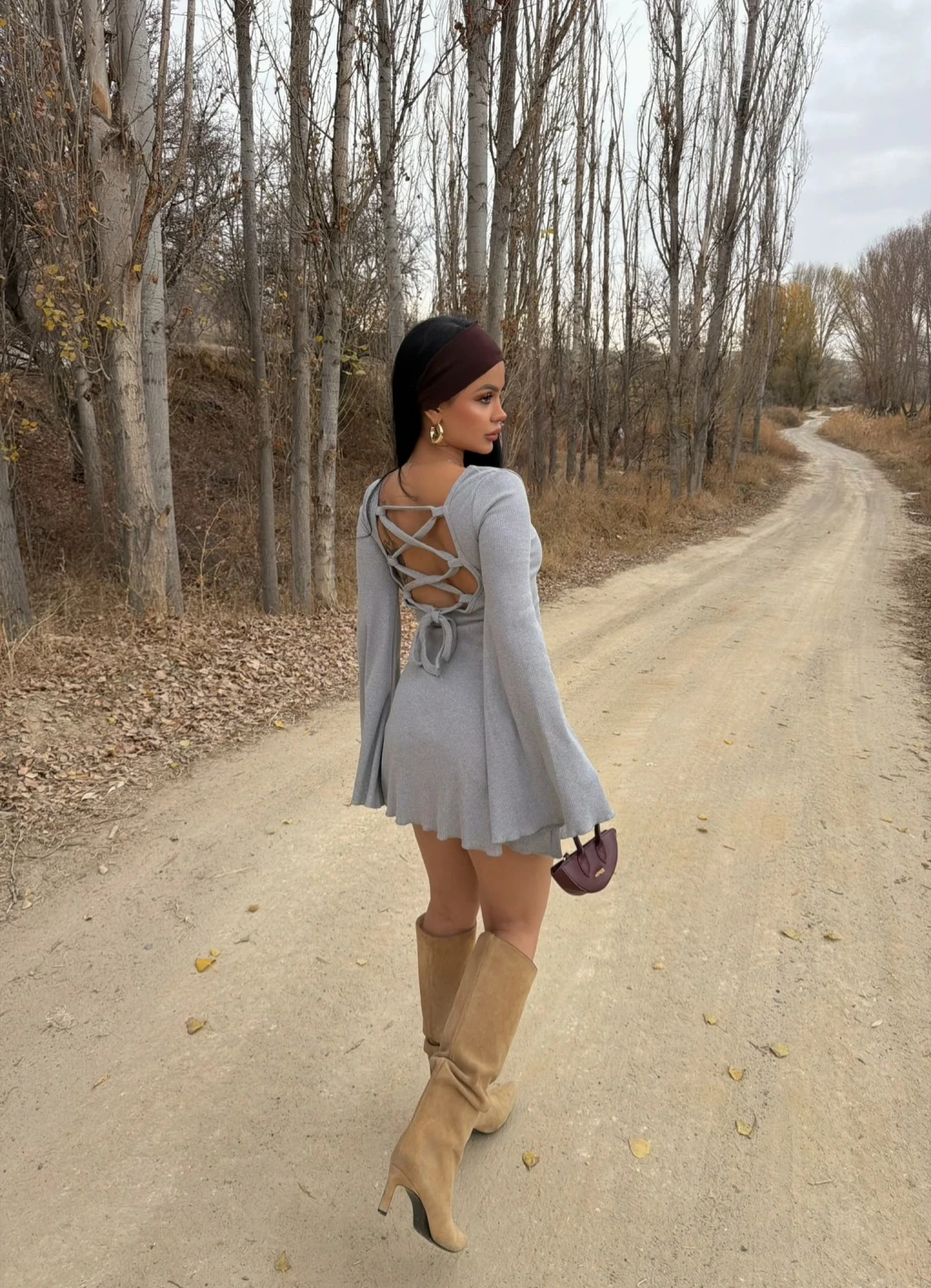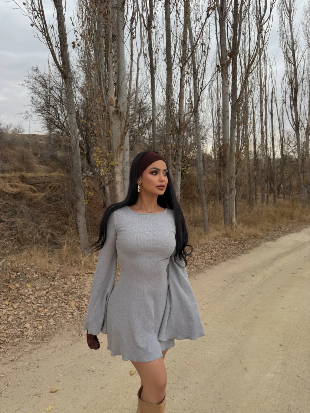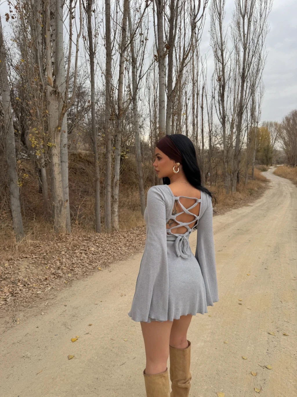 Sırt dekoltesi ve volan detayıyla büyüleyici bir görünüm sunar.