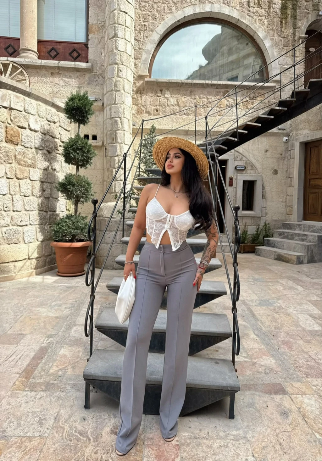 İnce bel kısmı ve geniş paçasıyla vücudu saran bu pantolon, her beden tipine uyum sağlar.