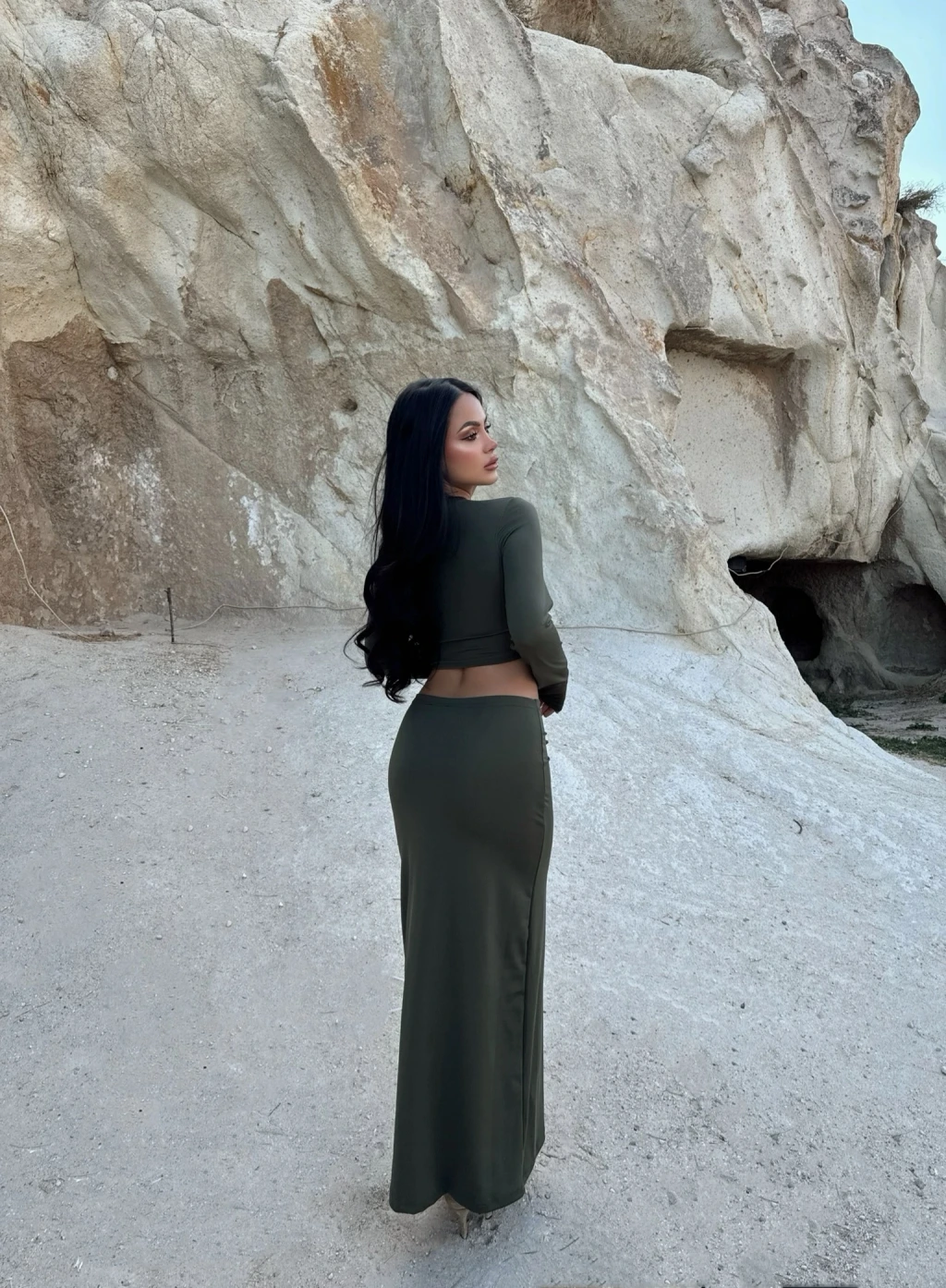 İnce detaylarıyla ön plana çıkan bu takım, feminen ve zarif bir görünüm sunmaktadır.