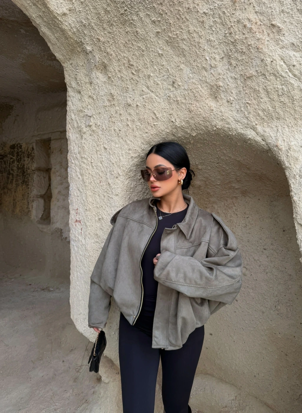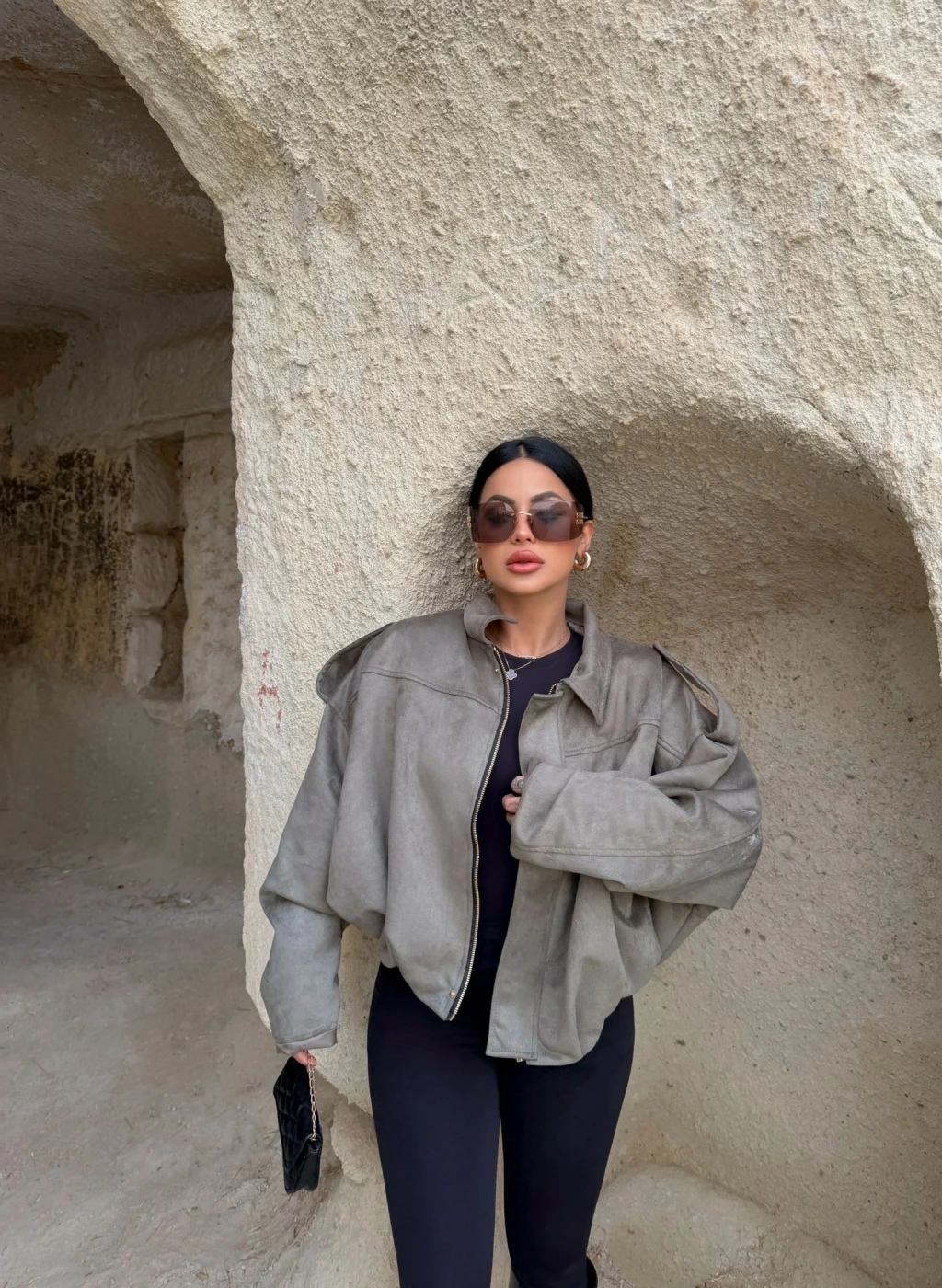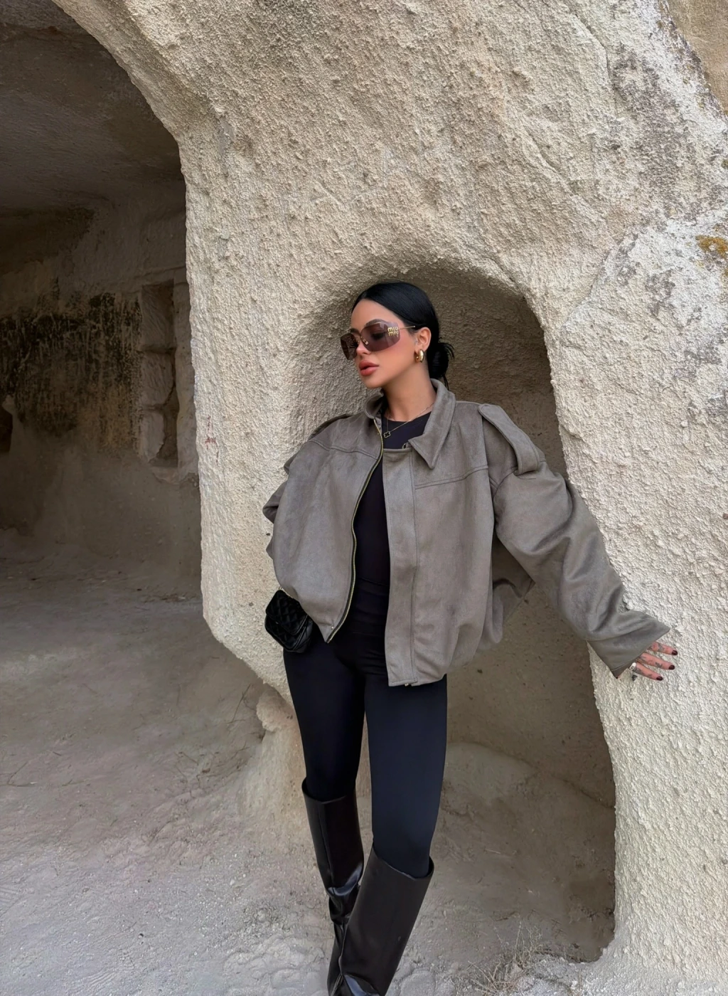 Gri Bel Lastikli Kaşe Bomber Ceket