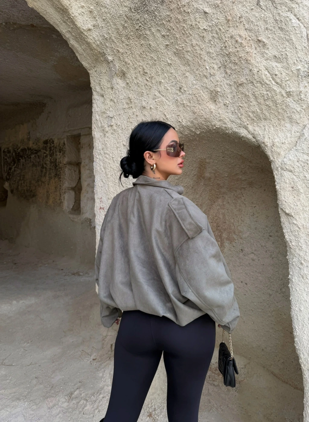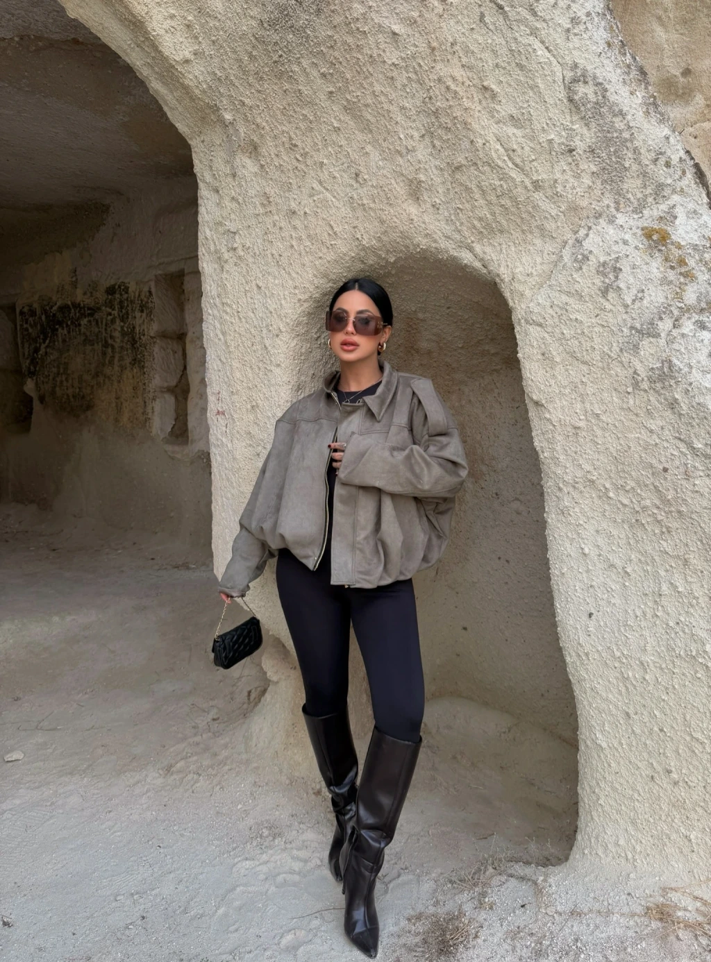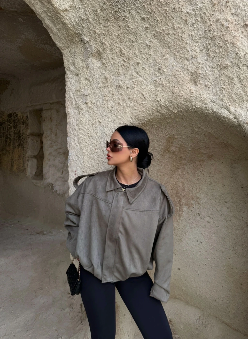 Gri Bel Lastikli Kaşe Bomber Ceket