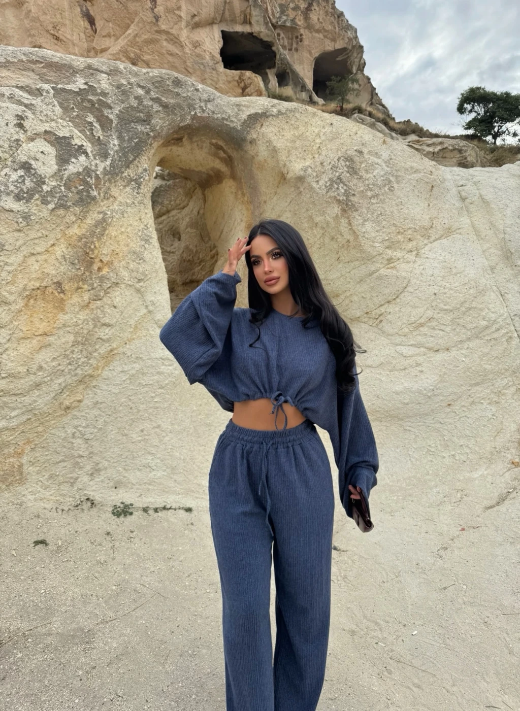 Yüksek bel pantolonu ise vücudu saran kesimiyle şıklık ve rahatlık sağlıyor.