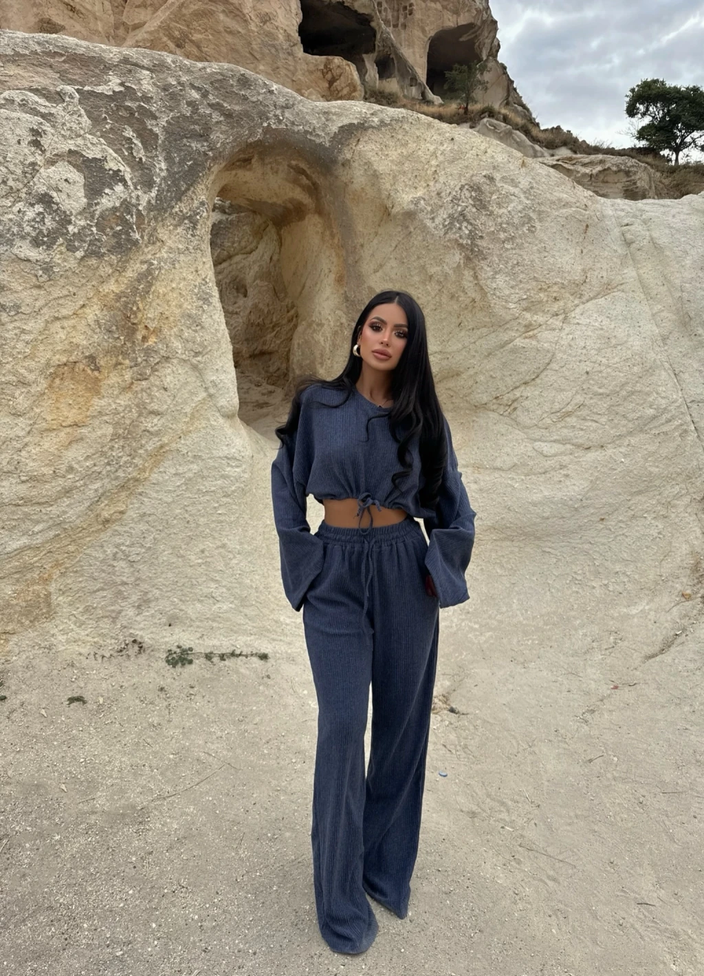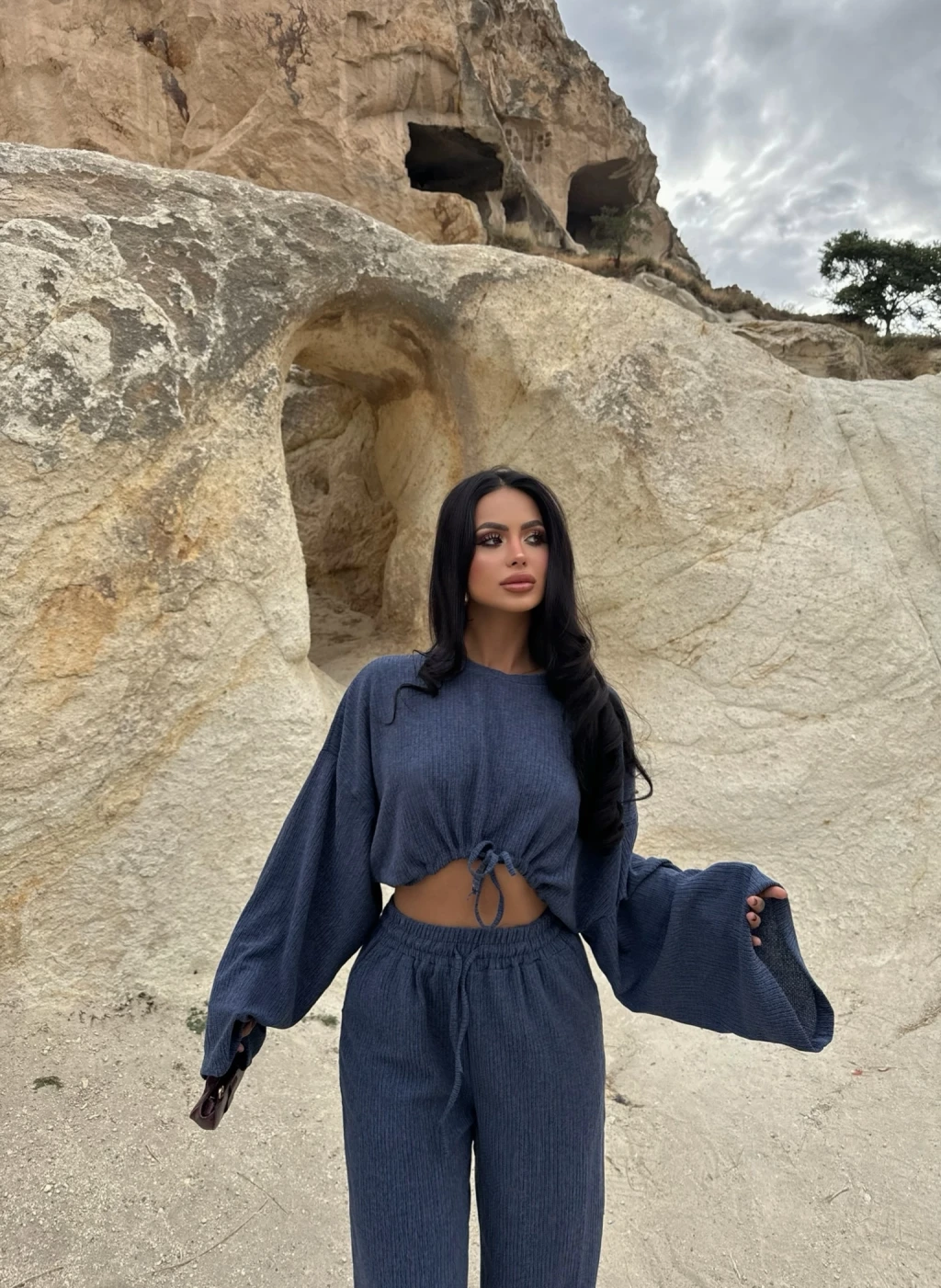Özel tasarım balon kollu bluzun modern detayları, takımın şıklığını ön plana çıkarıyor.