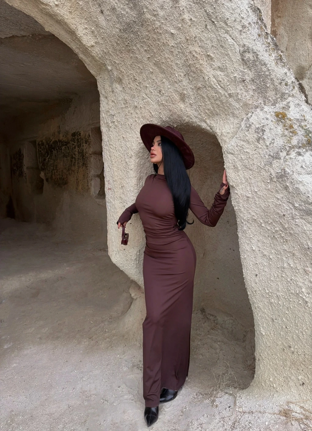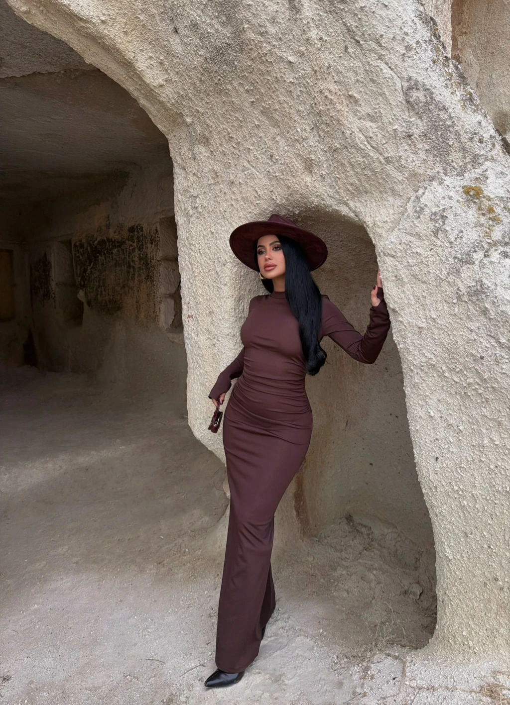 Şıklığı ve konforu bir arada arayanlar için ideal olan Dik Yaka Büzgülü Maxi Elbise, tarzınıza sofistike bir dokunuş yapacak.