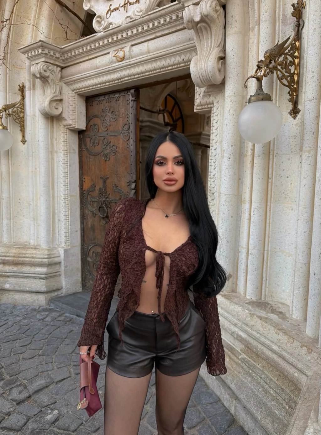 Kahve Göğüs Bağlamalı Güpürlü Crop
