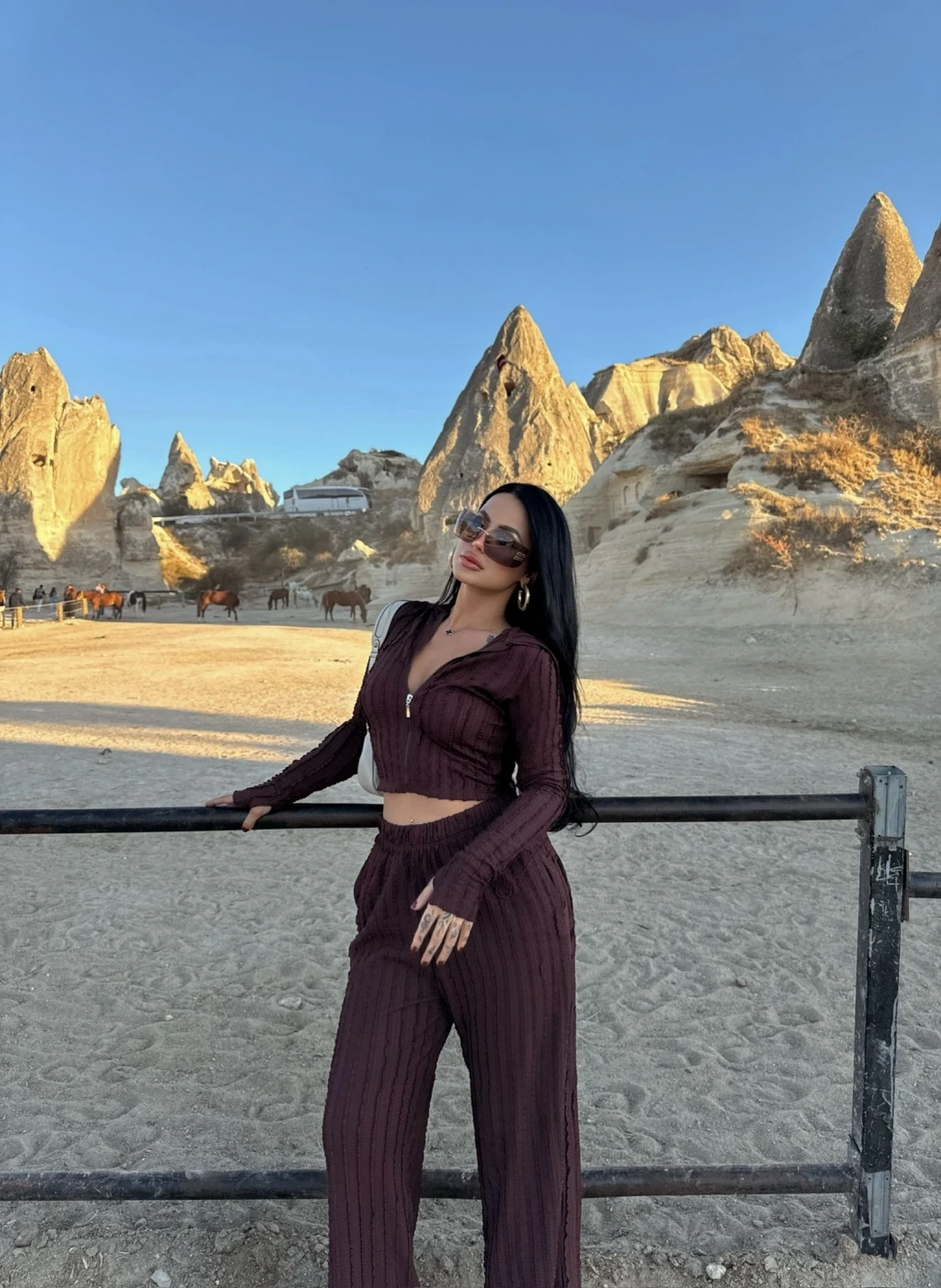 Kahve Kapşonlu Ters Dikiş İkili Takım