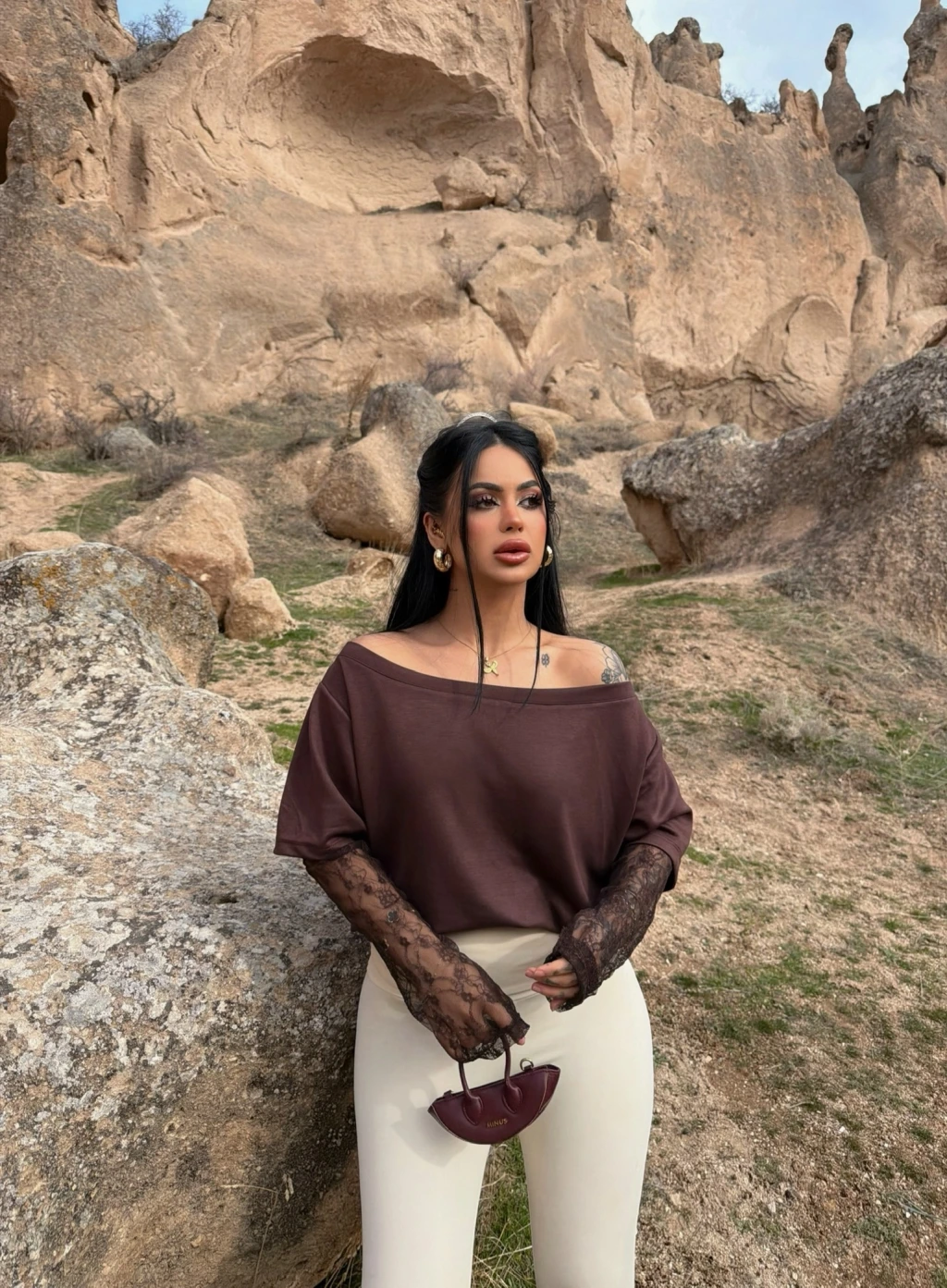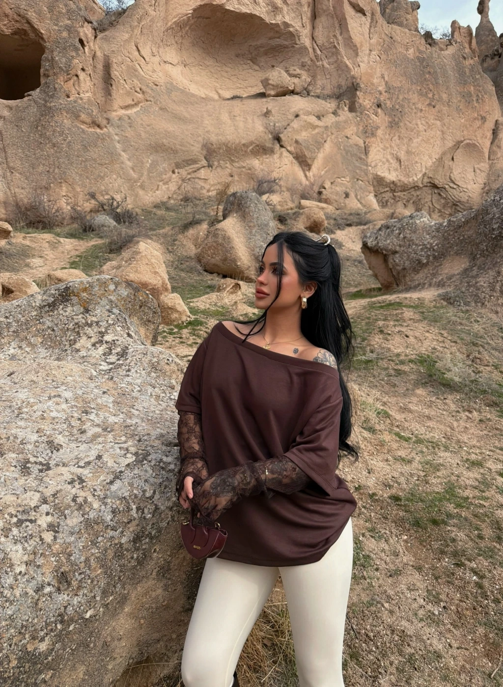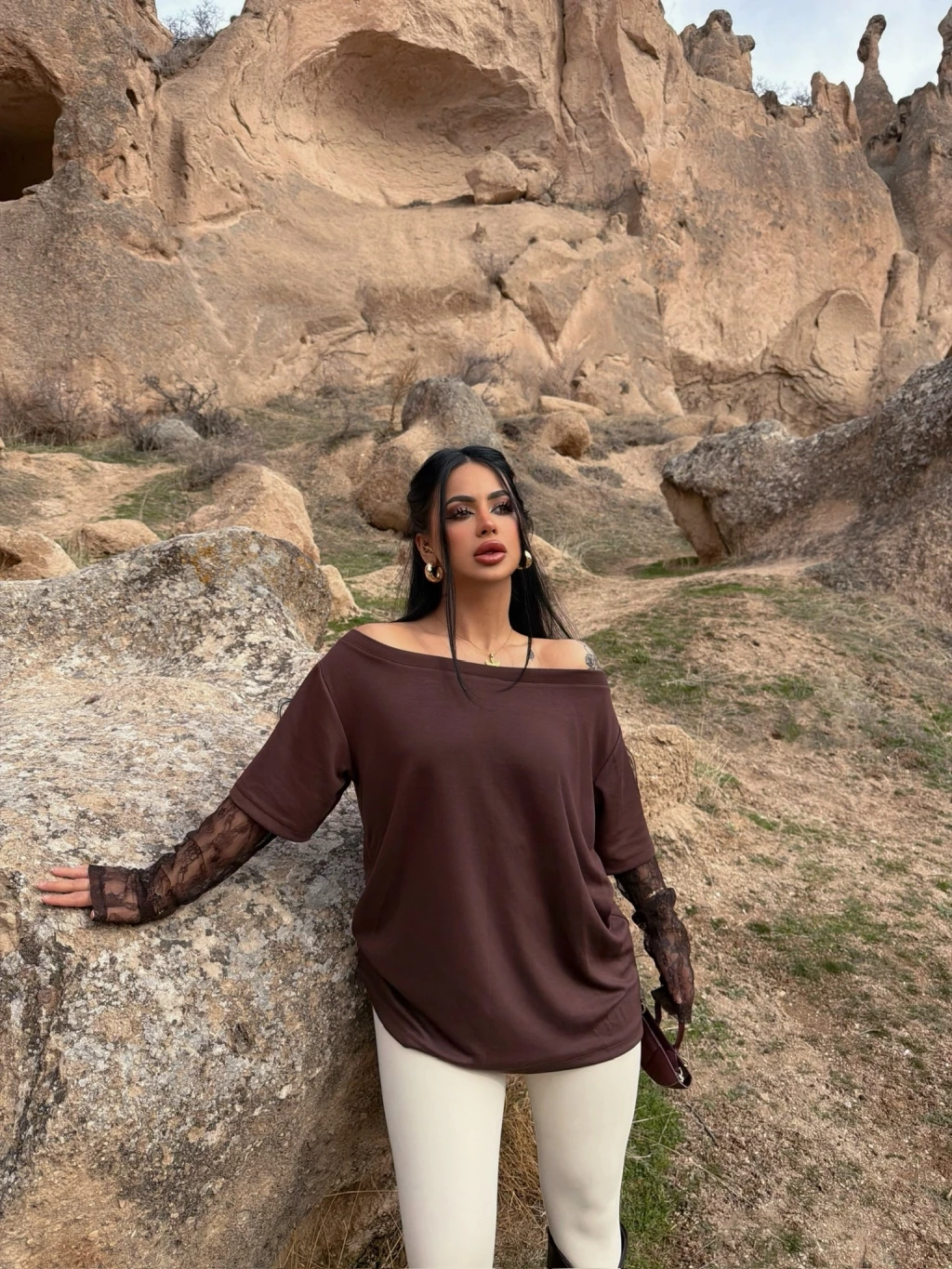 Kırmızı Butik'in Kayık Yaka Kolları Güpürlü Tişört'ü, şıklık ve rahatlığı bir arada sunuyor. Geniş ve rahat kesimi ile oversize tarzını yansıtan bu tişört, güpür detaylarıyla fark yaratıyor.