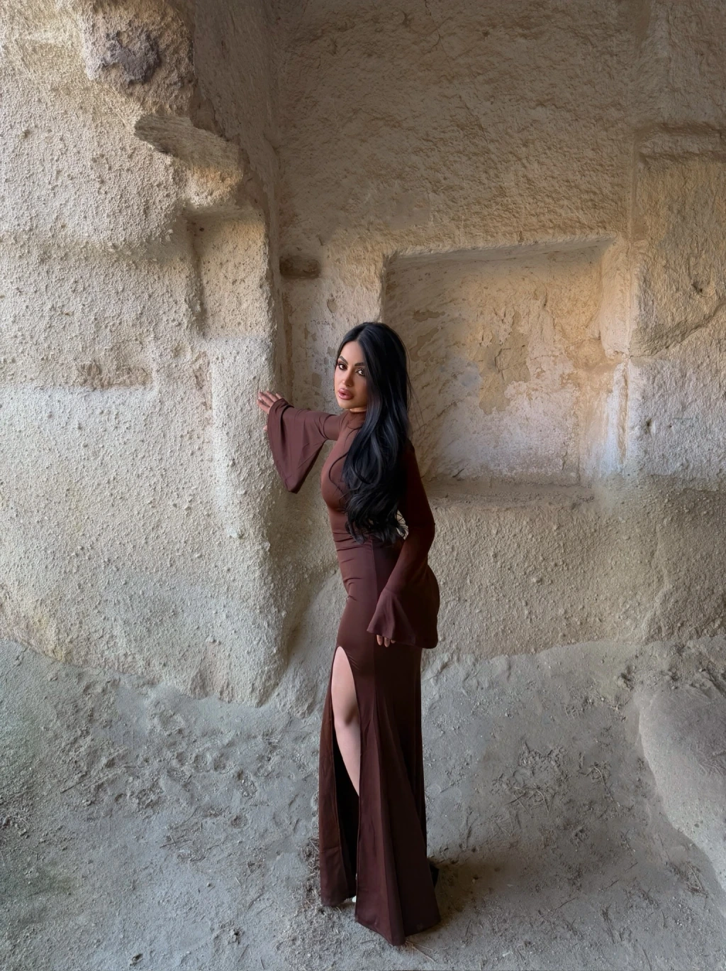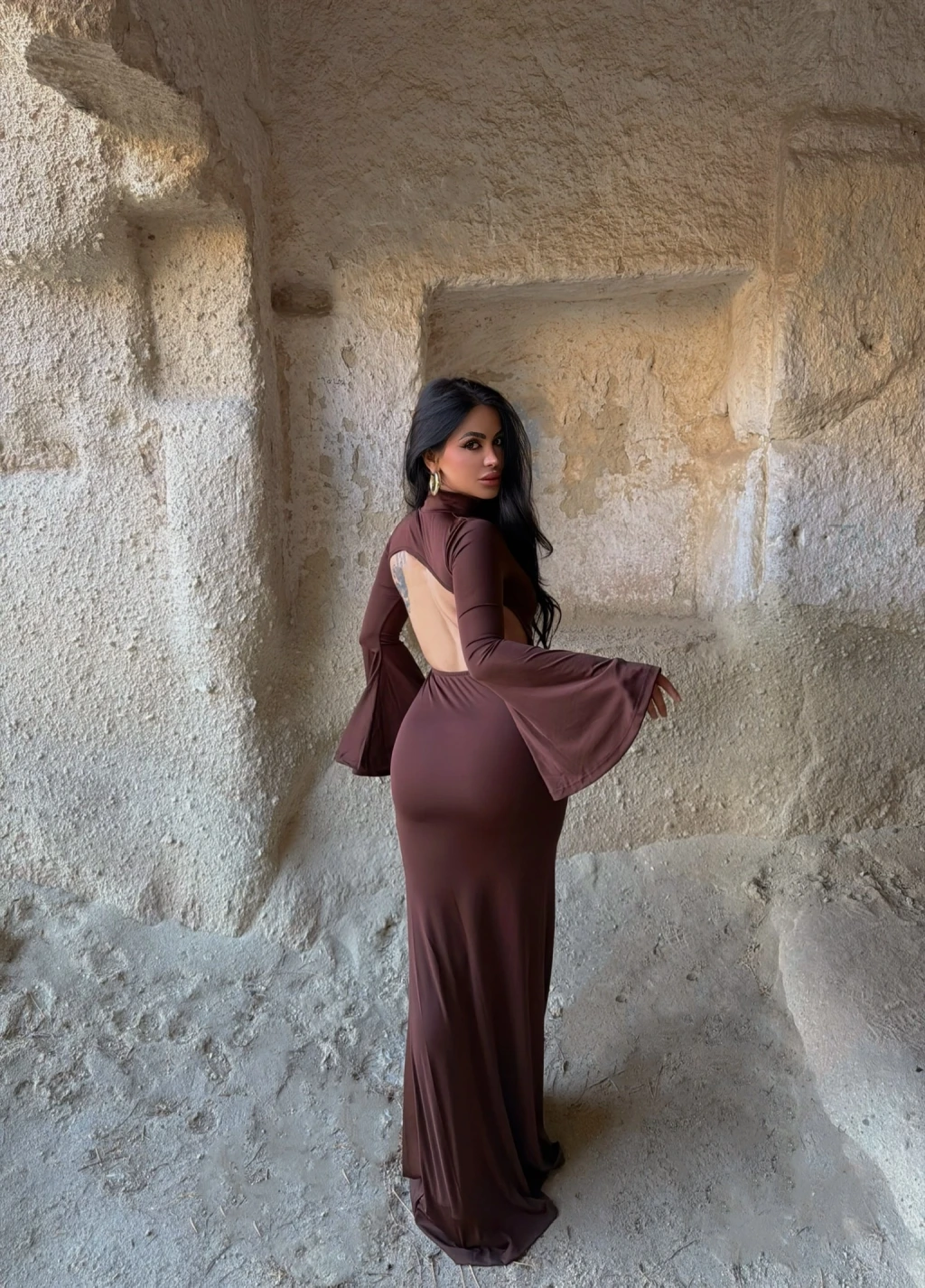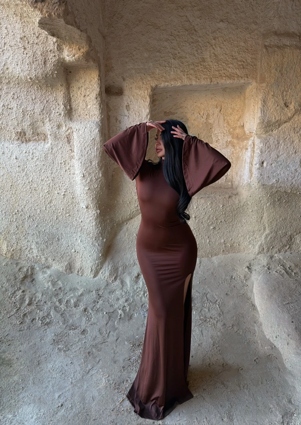 Kahve Kolları Volanlı Maxi Elbise