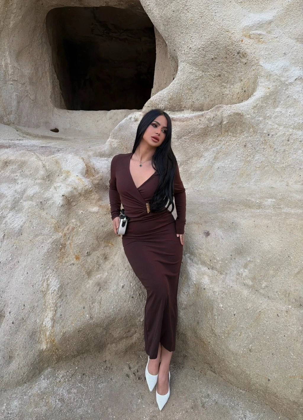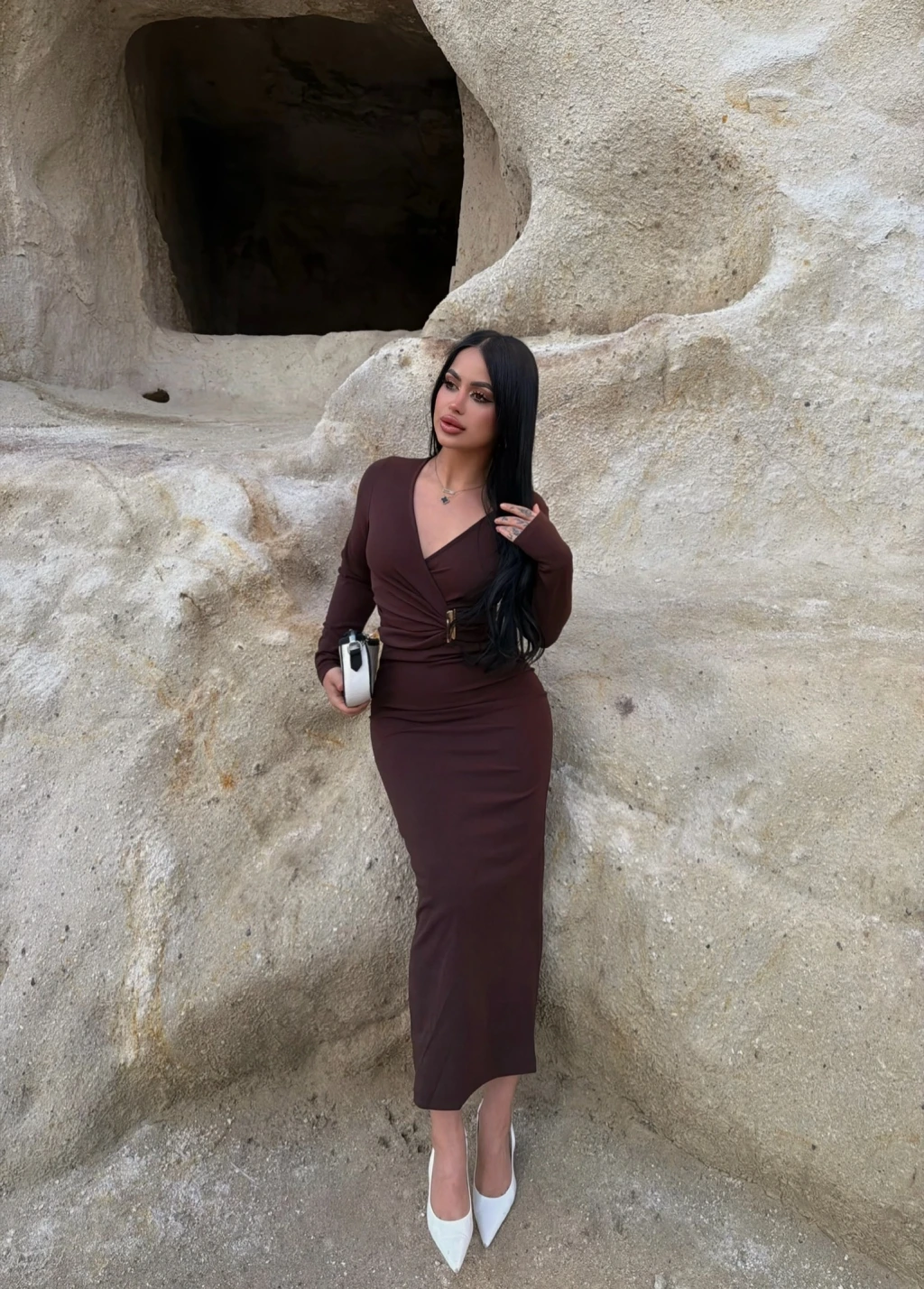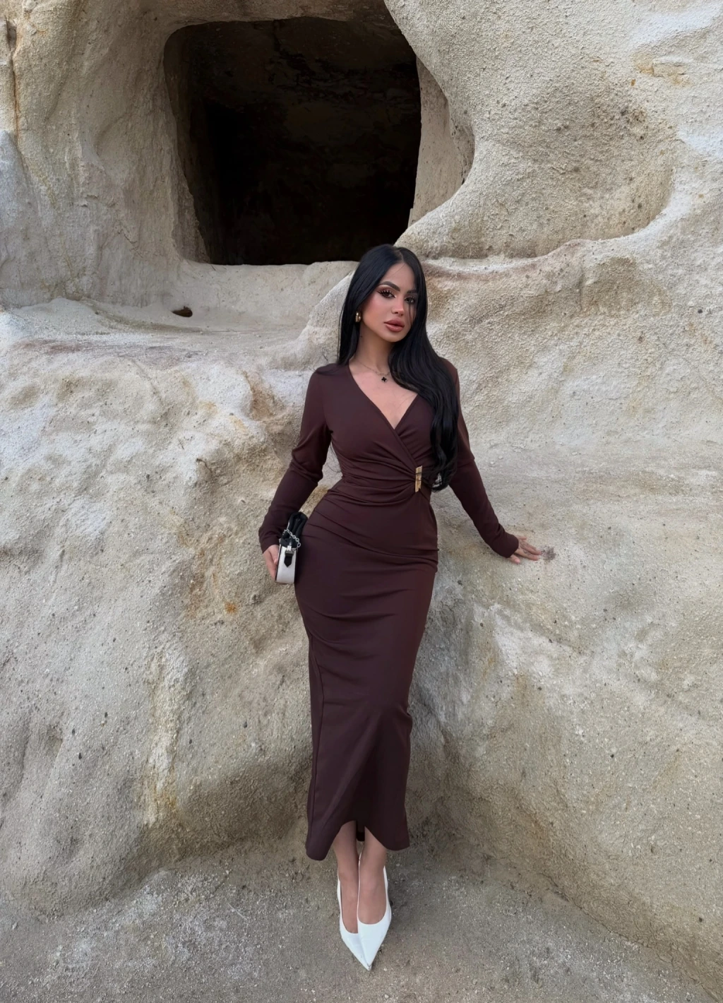 Kahve Kruvaze Yaka Tokalı Elbise