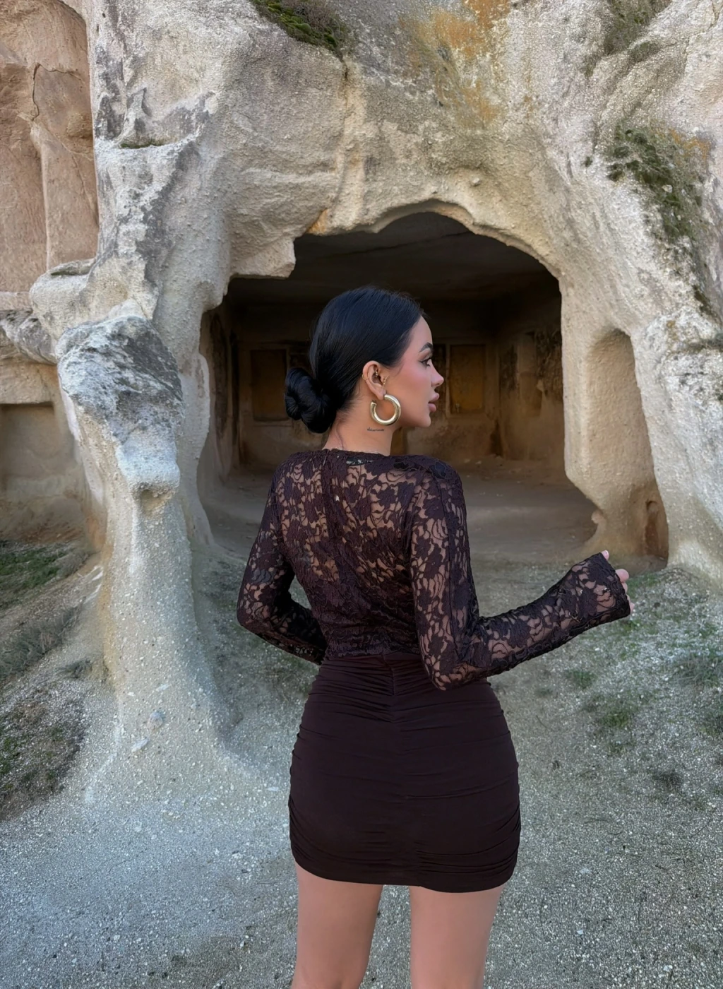 Kahve Omuz Vatkalı Güpürlü Elbise