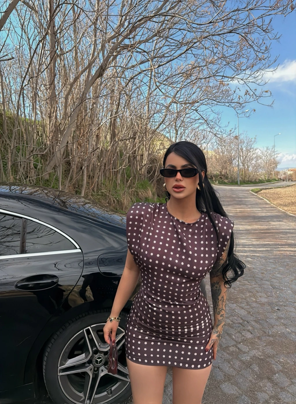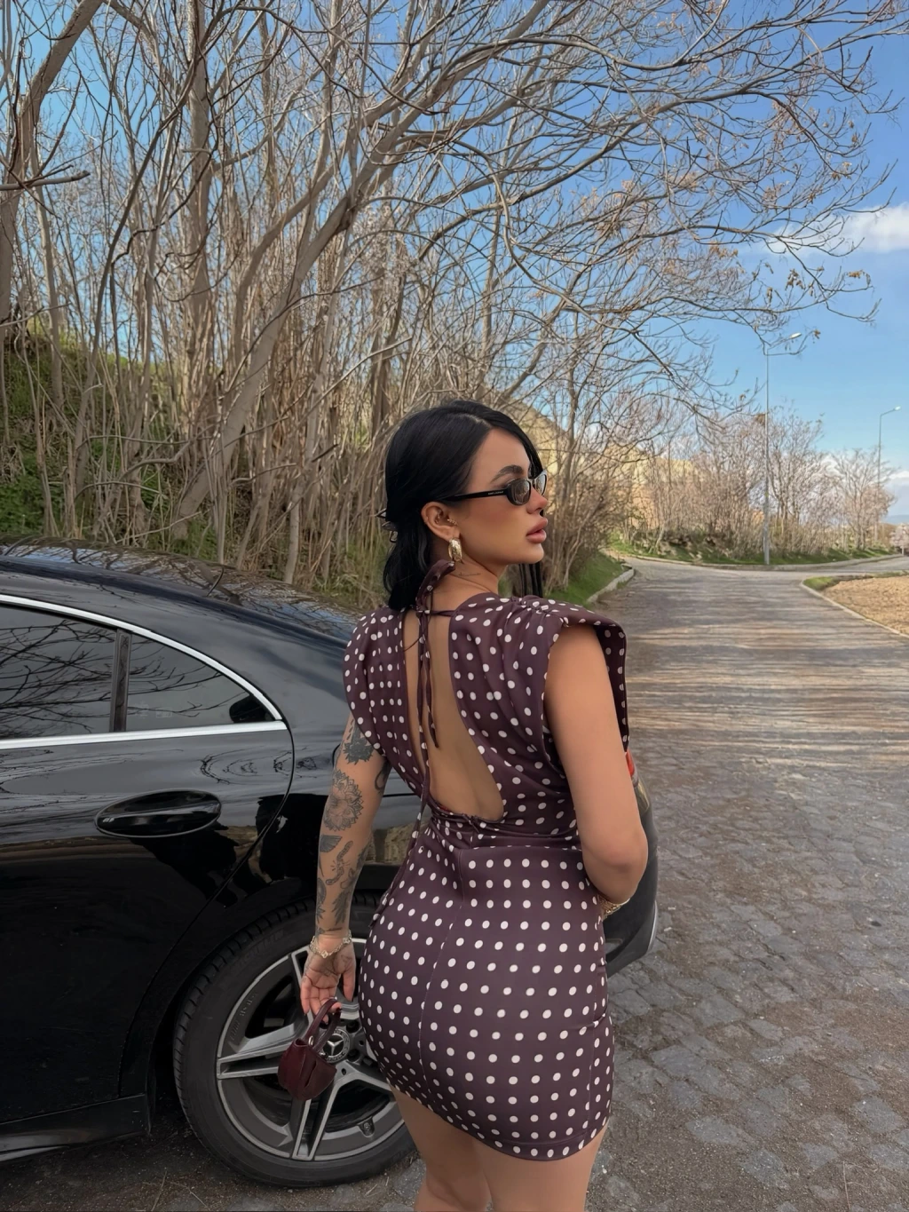 Kahve Omuz Vatkalı Puantiyeli Elbise