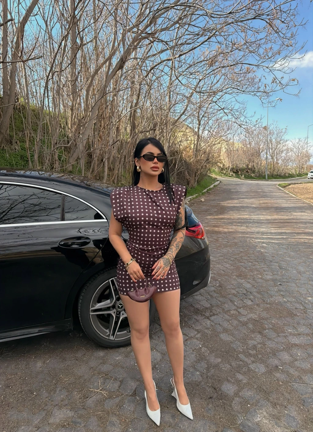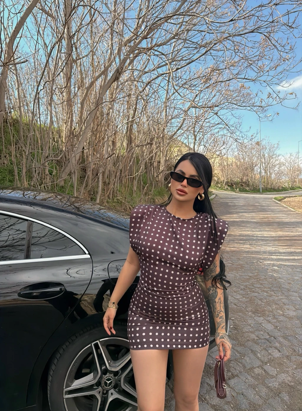 - Bu sezonun trendi olan puantiye desenli mini elbise.