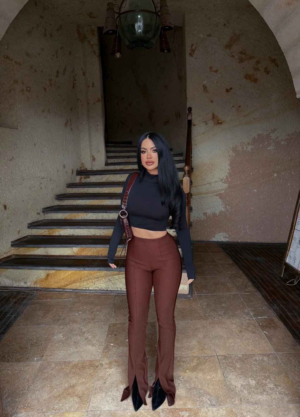 Kahve Ön Yırtmaçlı Fitilli Pantolon