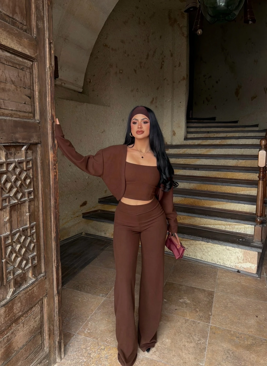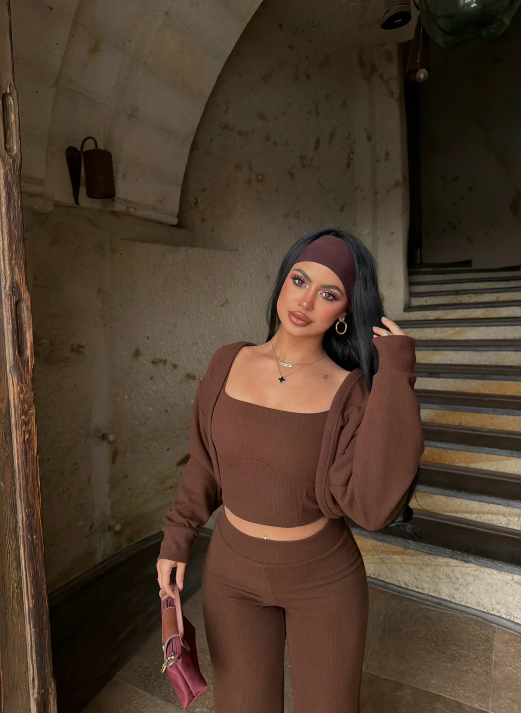 - Örme hırka ile yelek ve pantolondan oluşan üçlü takımdır.