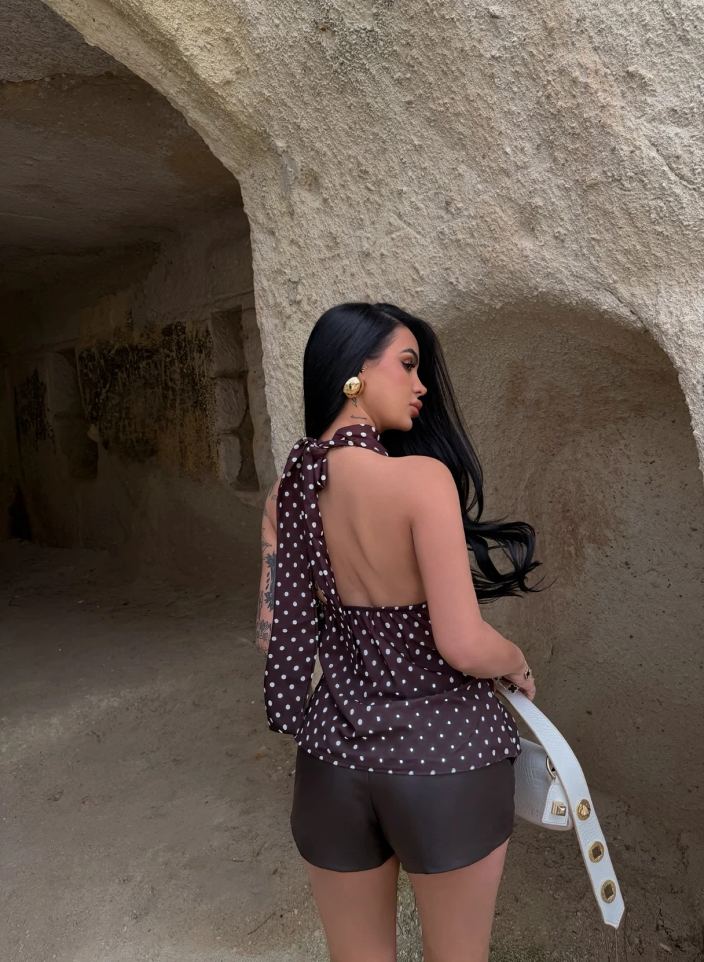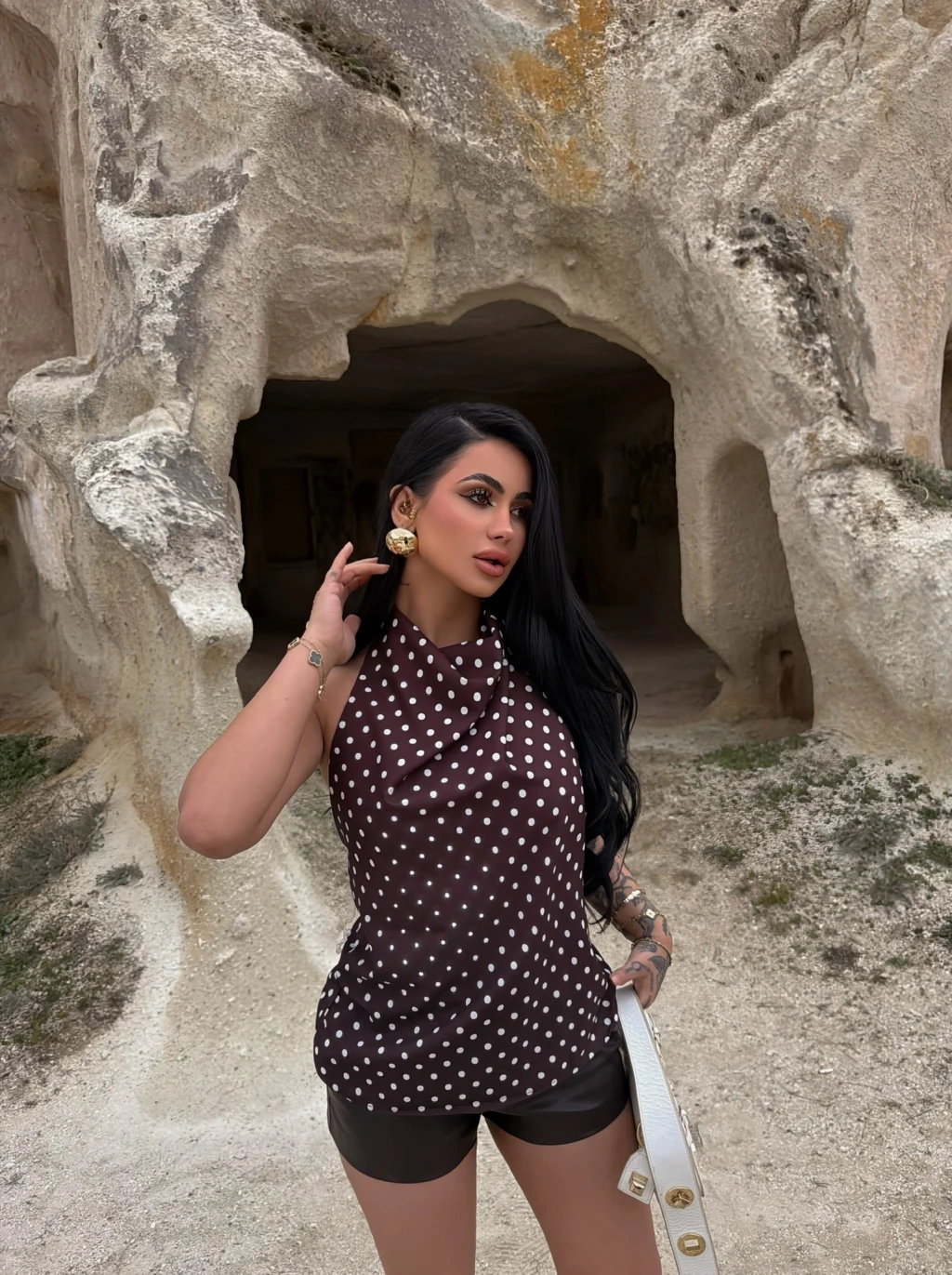 - İnce puantiye deseni, bluza hafif ve zarif bir hava katar.