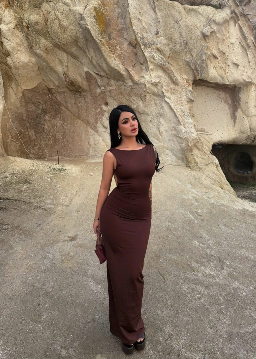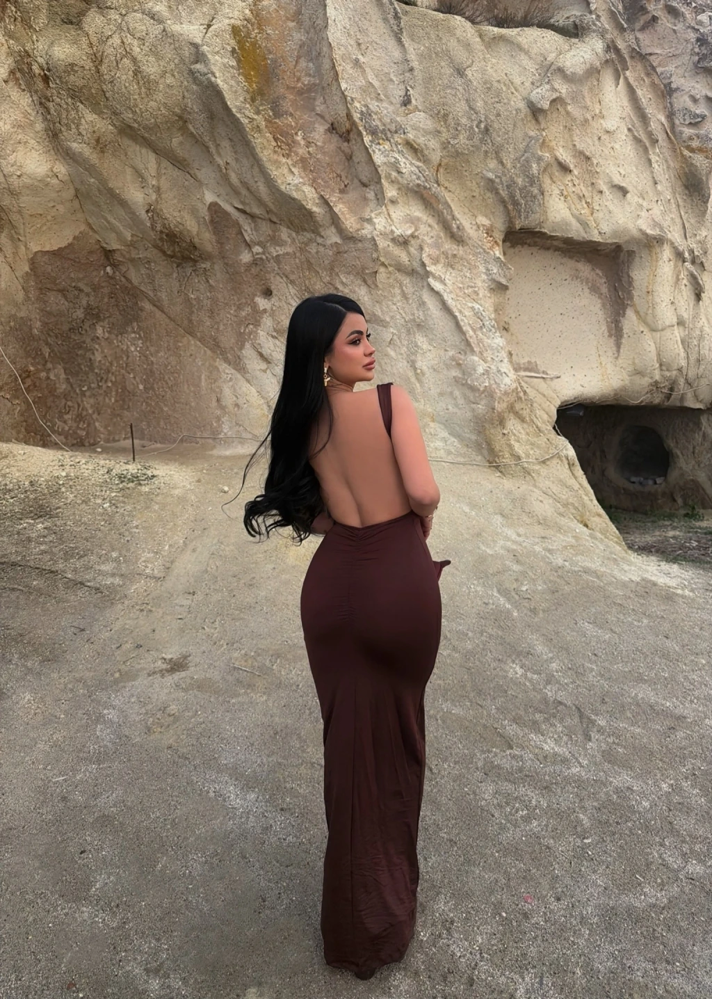 Kahve Sırt Açık Long Elbise