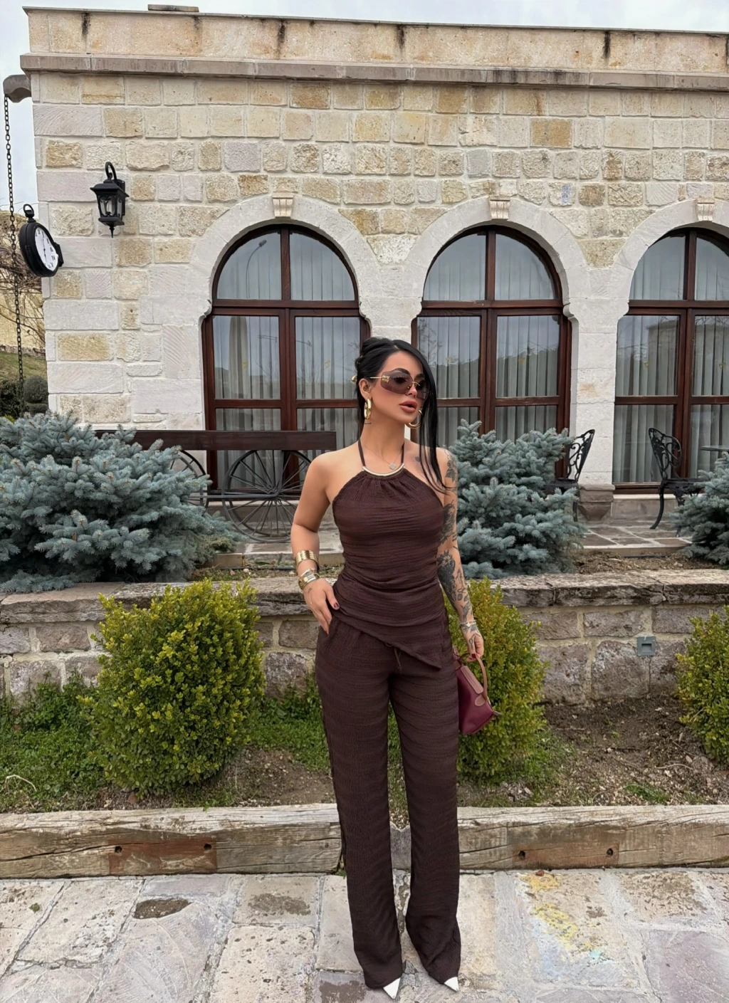 Kahve Yaka Aksesuarlı İkili Takım ile tarzınızı konuşturun, kendinizi özel ve şık hissedin!