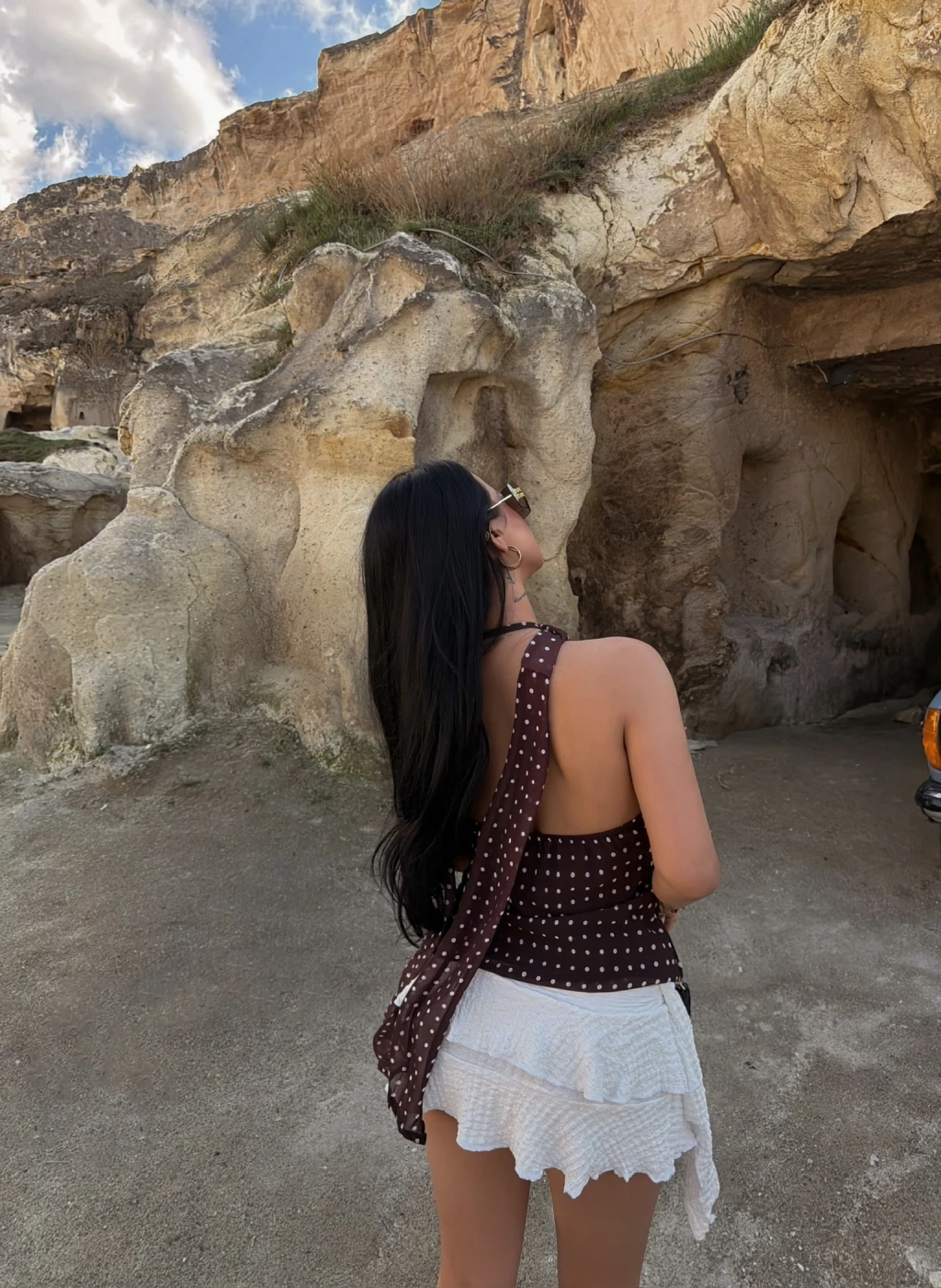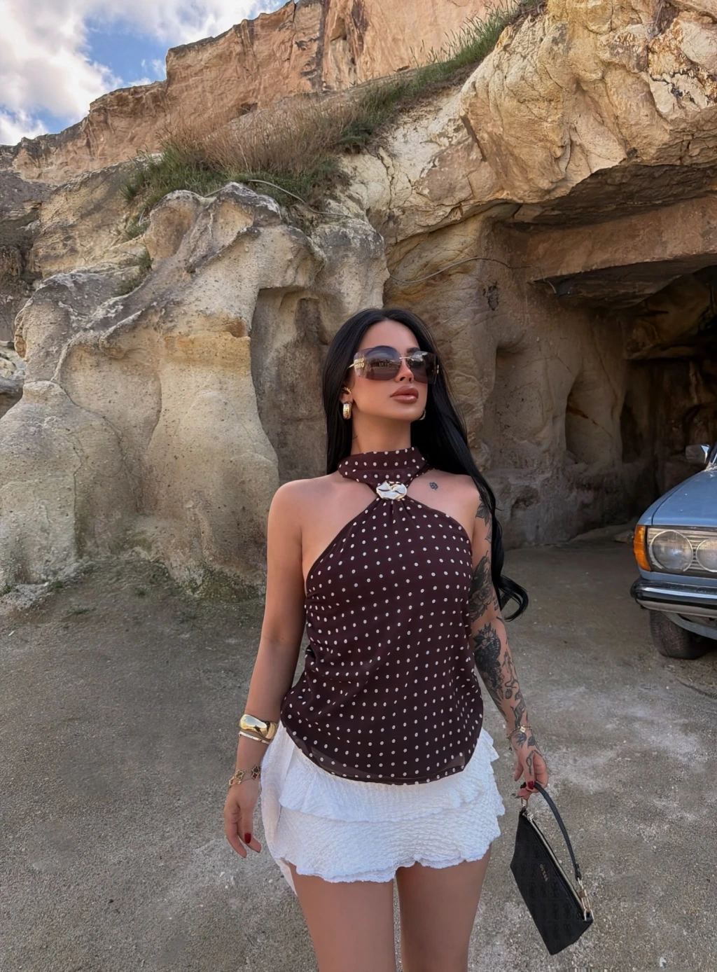 Kahve Yaka Tokalı Puantiyeli Bluz