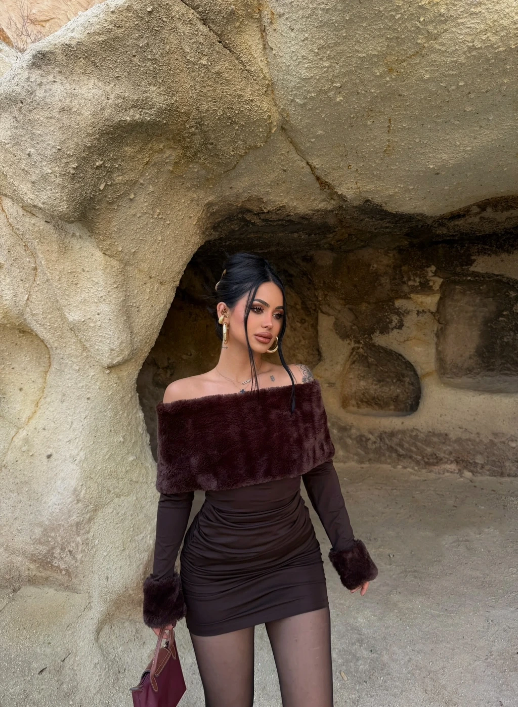 Yakası Kürklü Madonna Elbise, Kırmızı Butik'in son koleksiyonundan bir parçadır.