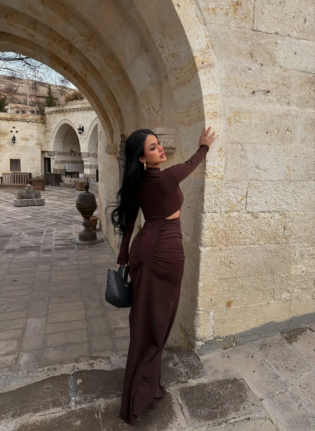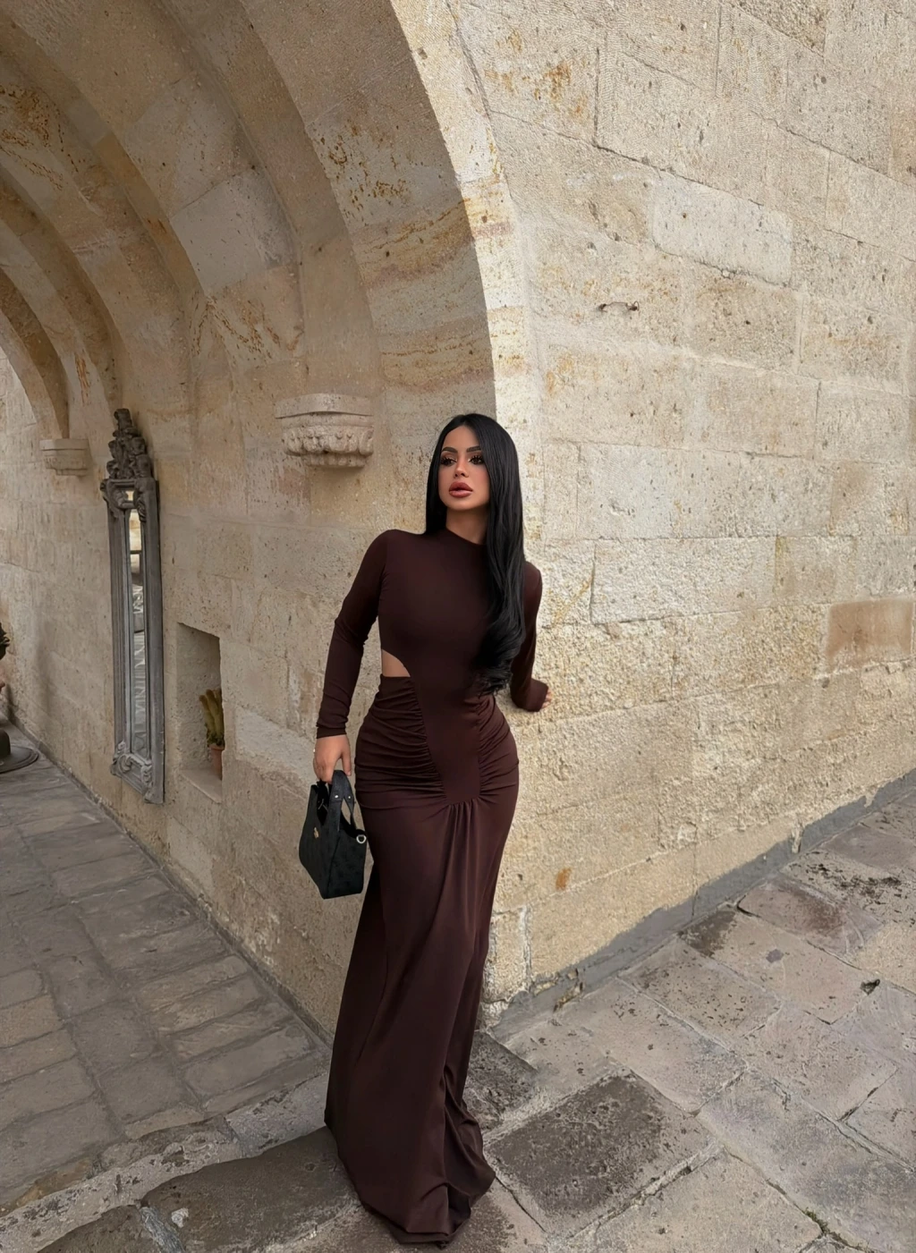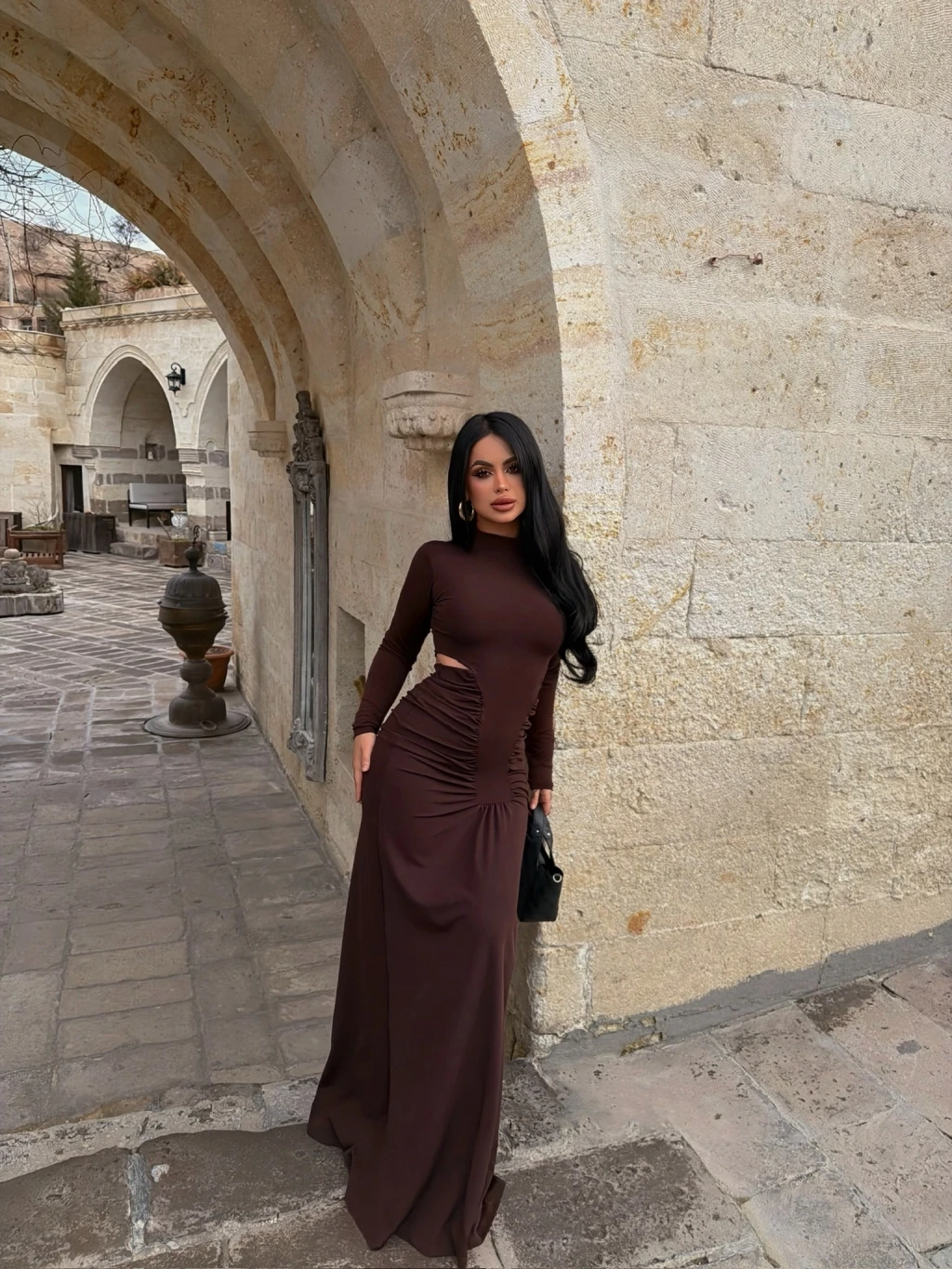 Kahve Yan Pencereli Balık Sırtı Elbise