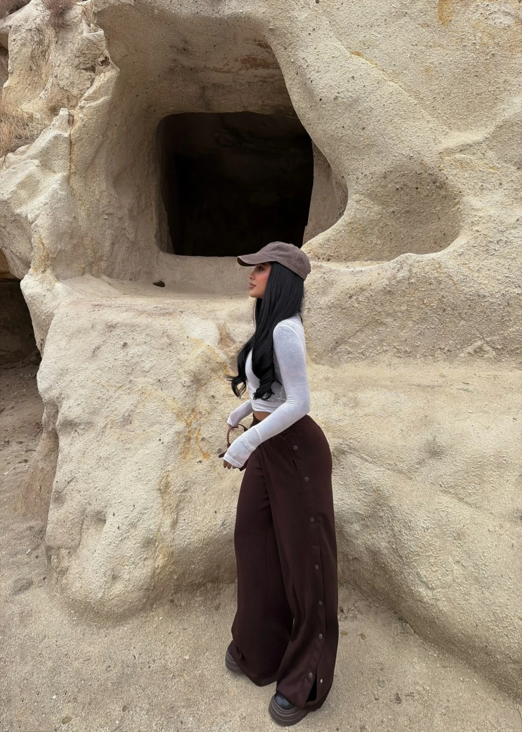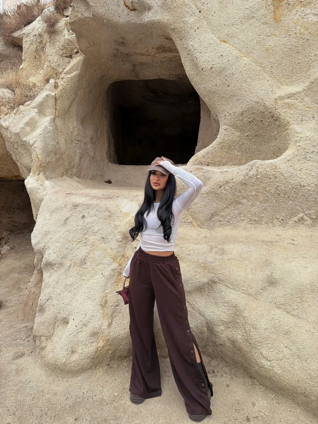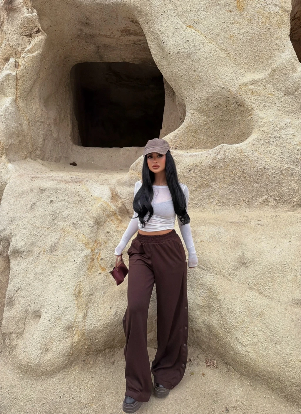 Yanı çıtçıtlı palazzo pantolon, şıklığı ve rahatlığı bir arada sunan Kırmızı Butik'in özel tasarımıdır.