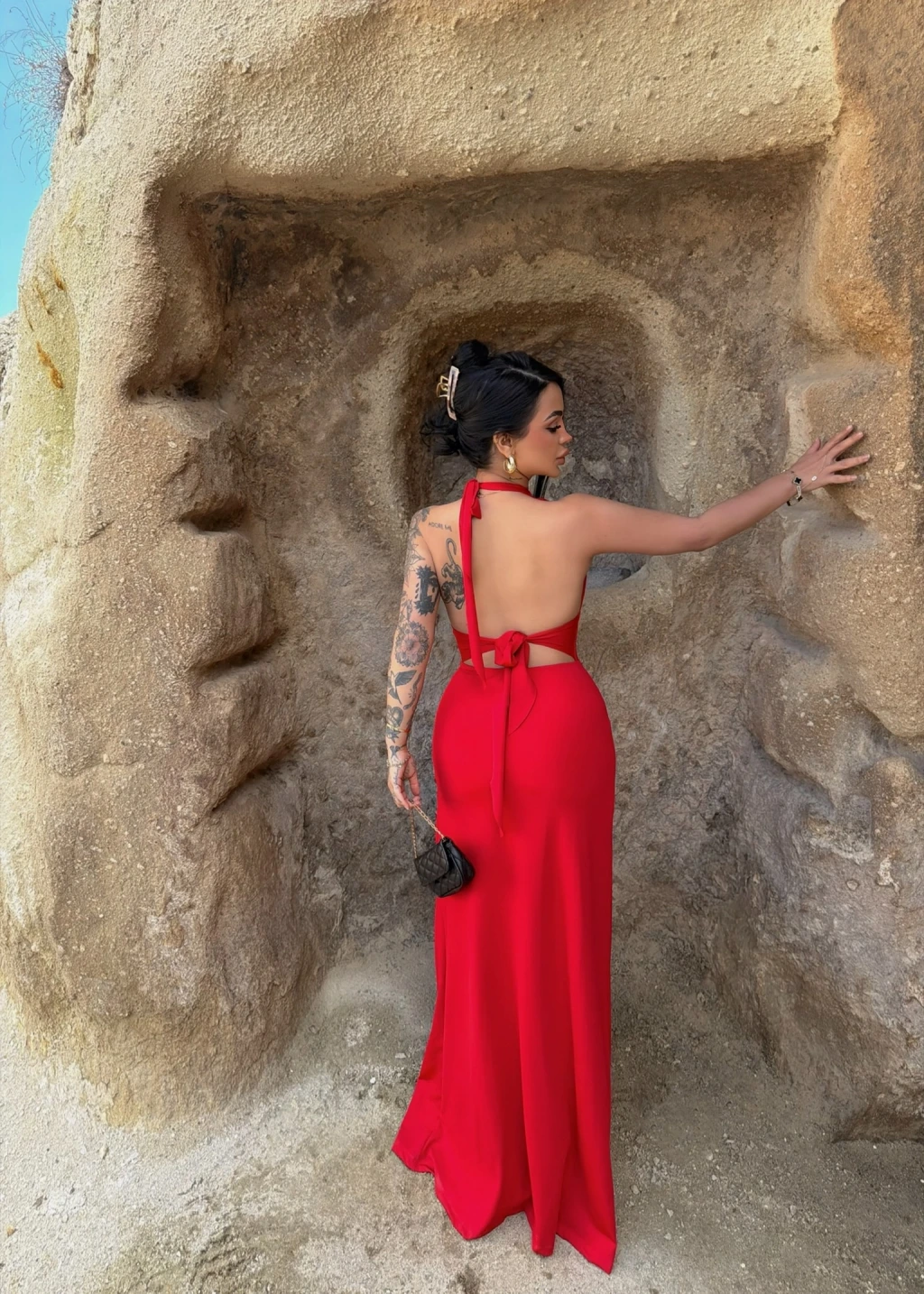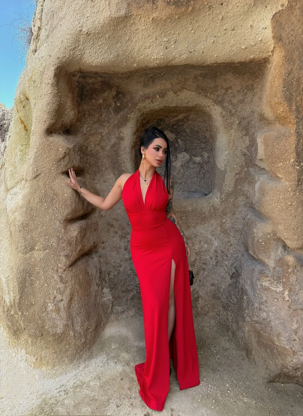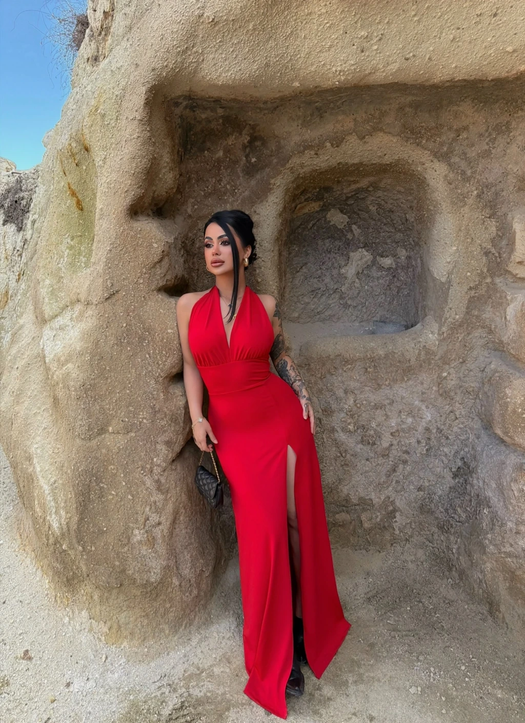 Kırmızı Butik Boyundan Geçmeli Yırtmaçlı Elbise ile stilinizi tamamlayarak her ortamda göz kamaştırabilirsiniz.