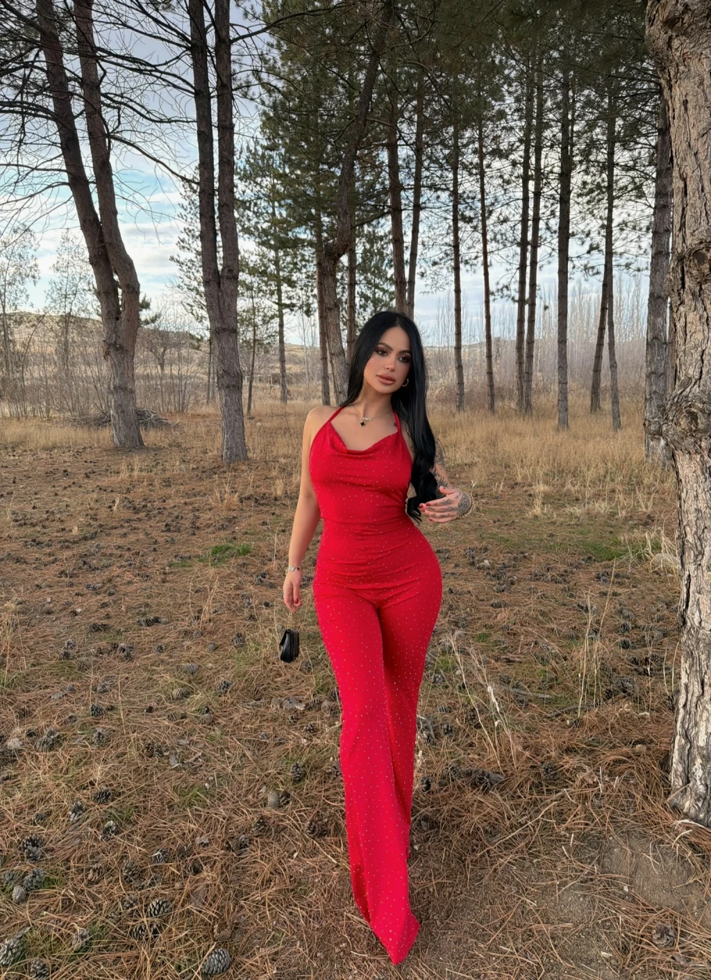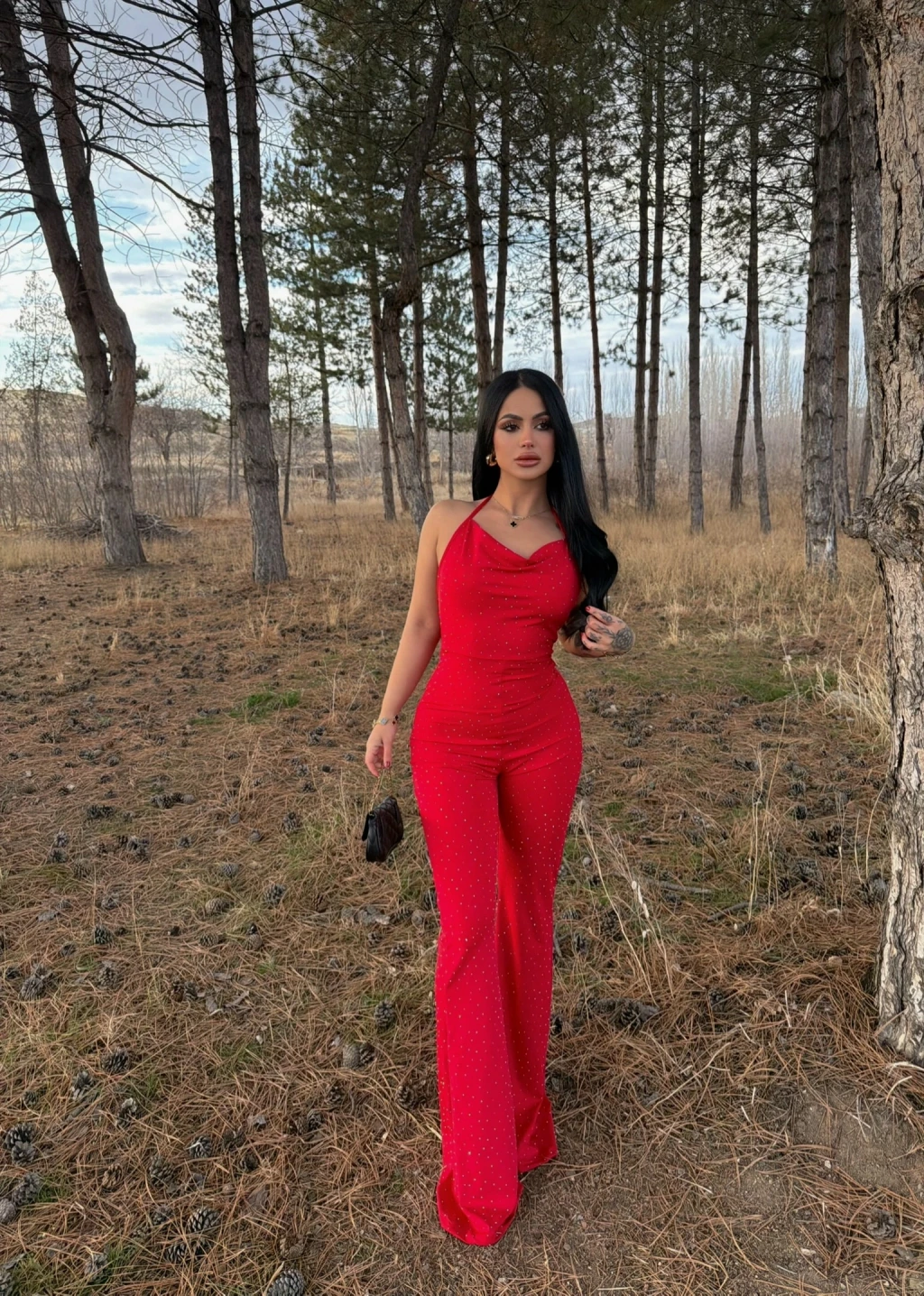 Modanın en yeni trendleriyle buluşmak ve tarzınızı yansıtmak için Kırmızı Butik Degaje Yaka Taşlı Tulum'u tercih edebilirsiniz.