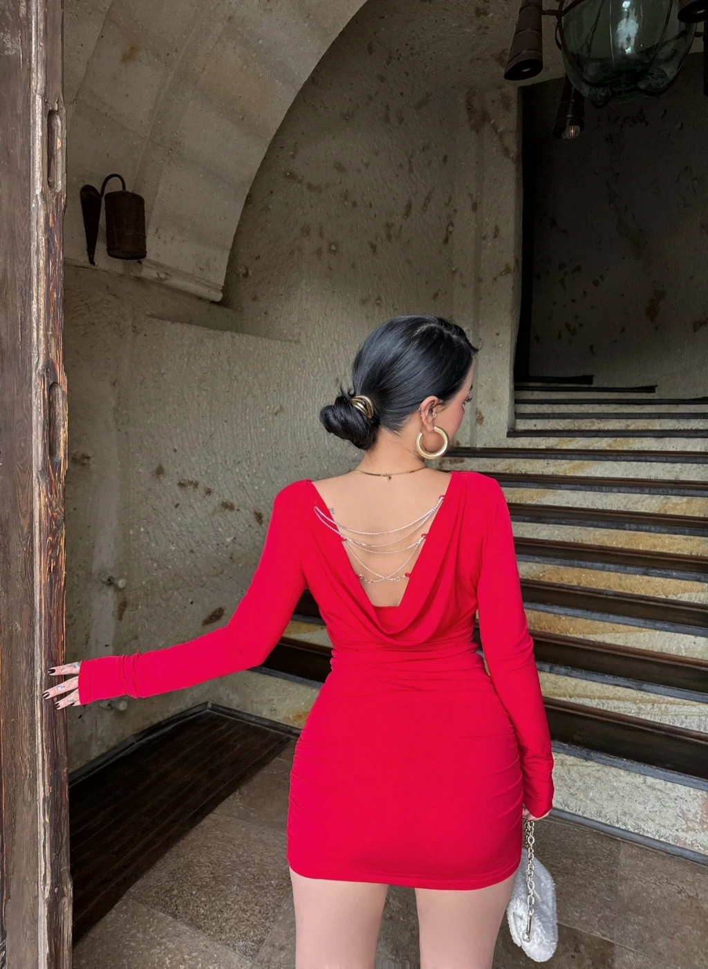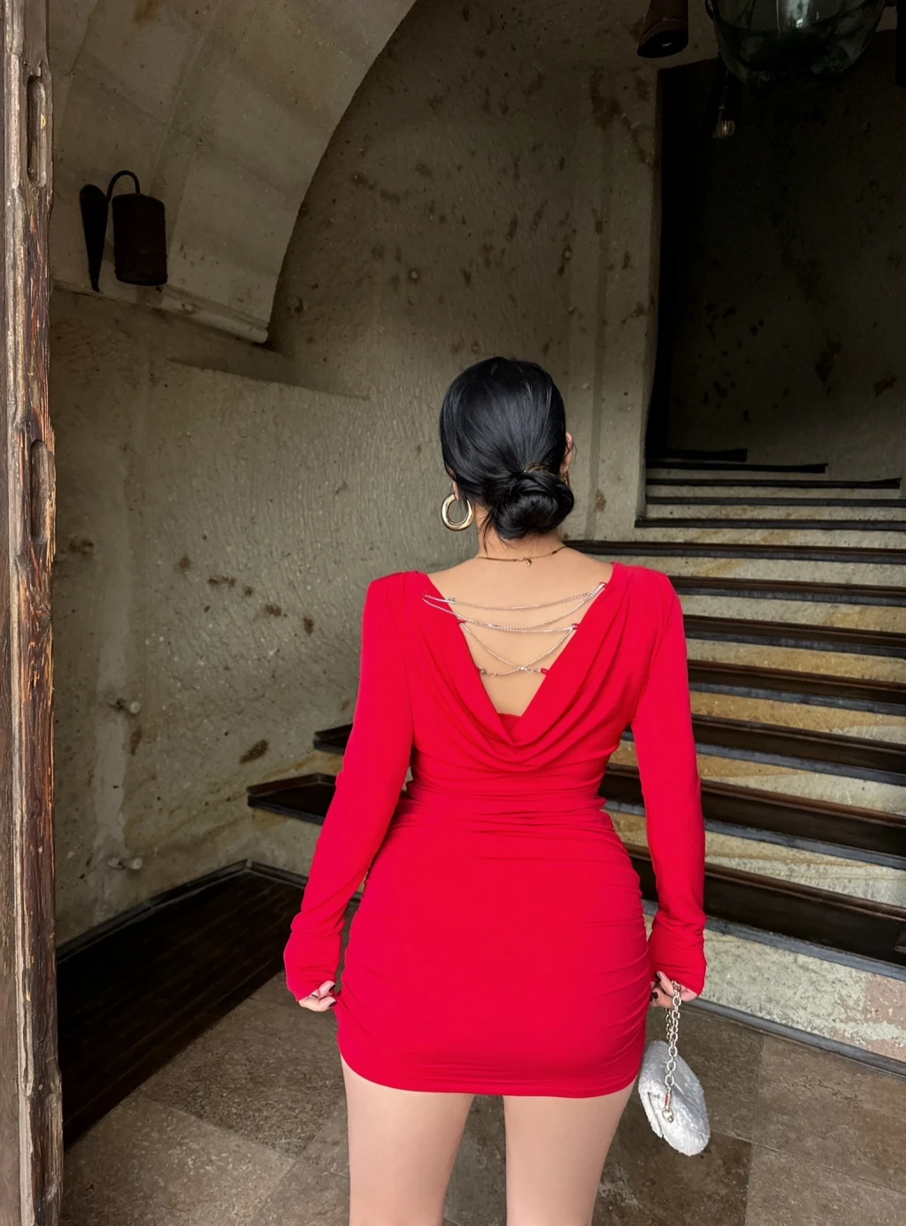 Zincirli Sırt Degaje Elbise, Kırmızı Butik'in tasarladığı şık ve cesur bir parçadır. Mini Elbise kategorisinde yer alan bu elbise, günlük kullanımdan özel davetlere kadar geniş bir kullanım alanı sunar.
