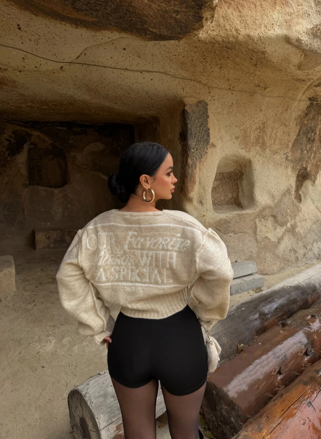 Krem Sırt Baskılı Düğmeli Hırka
