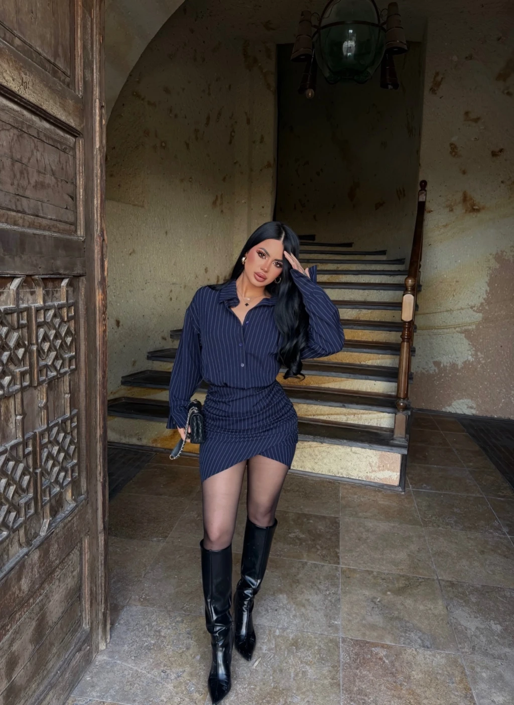 Lacivert renkteki çizgileriyle hareketlendirilmiş olan gömlek elbise, sportif ve şık tarzı bir arada sunar.
