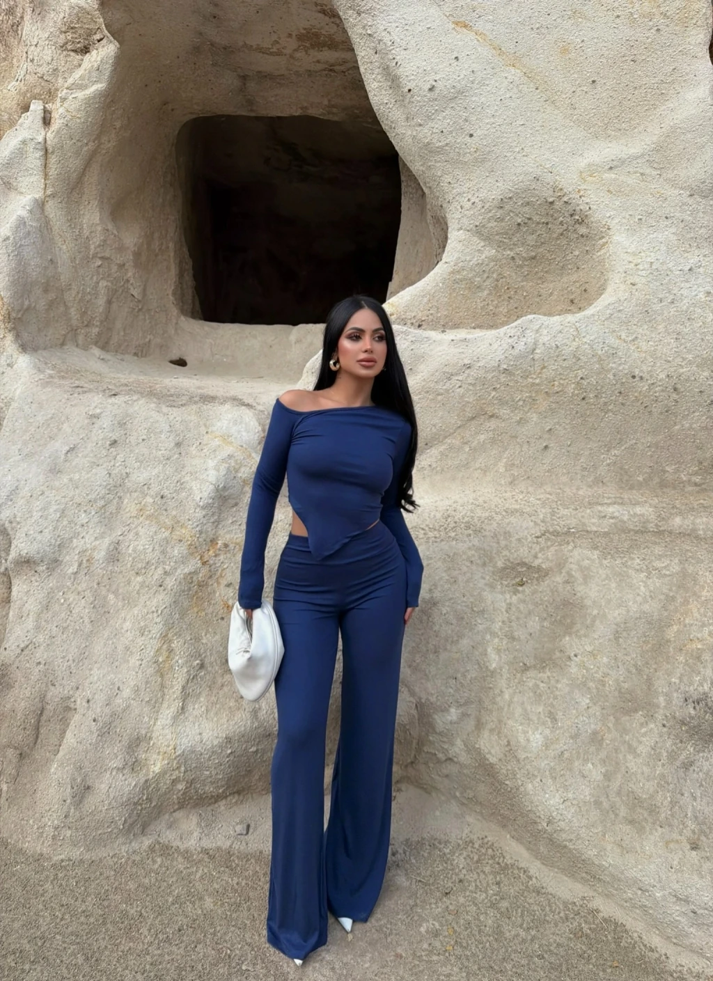 • Kayık yaka bluz ve buzlu keten pantolon kombinasyonundan oluşur