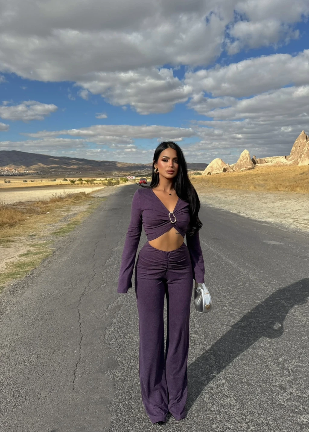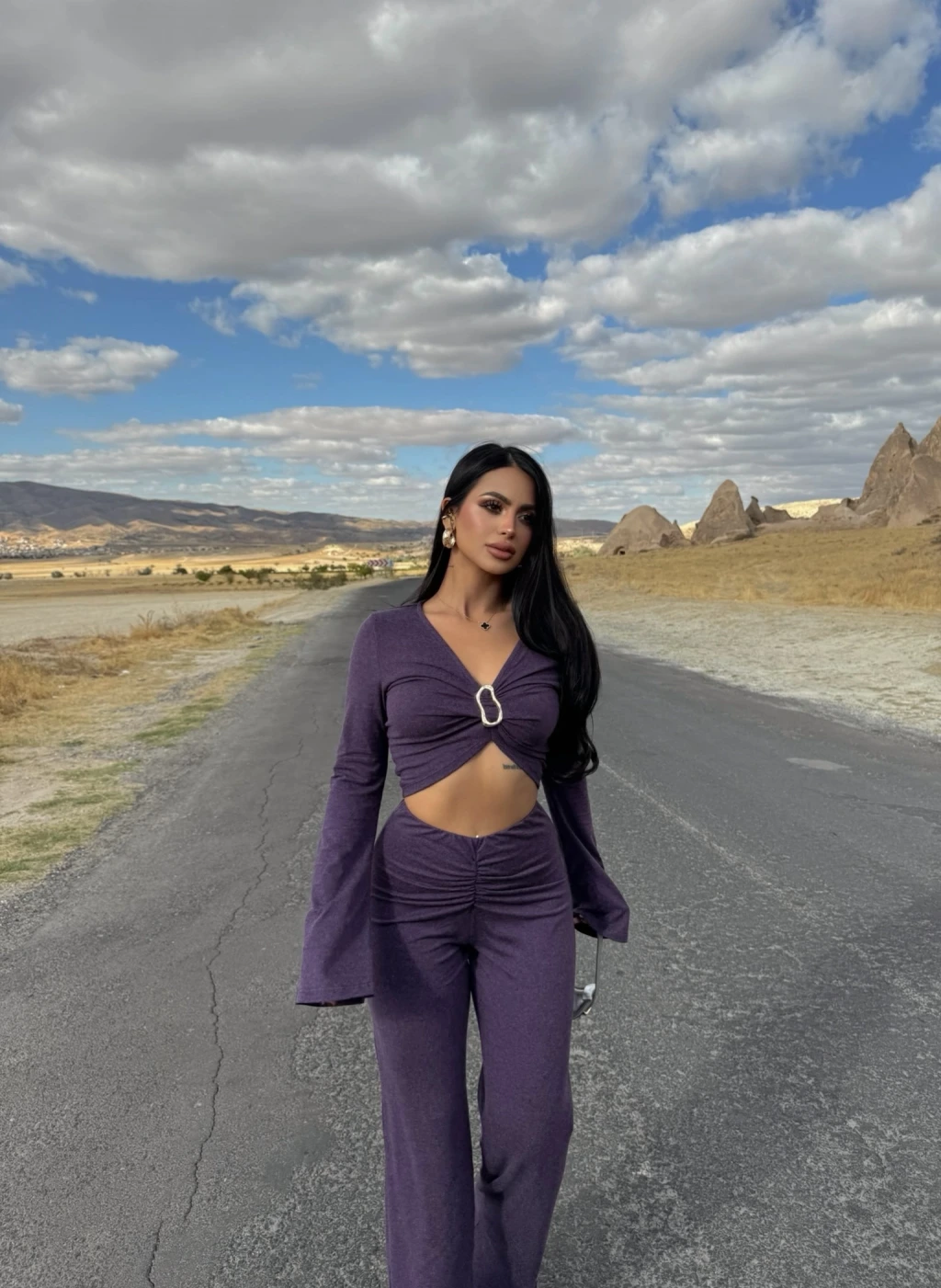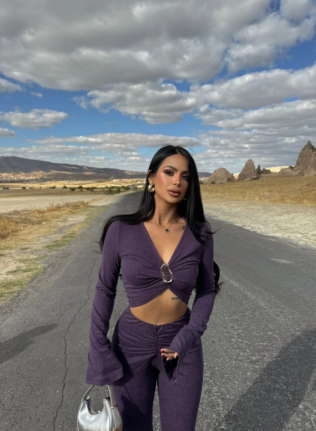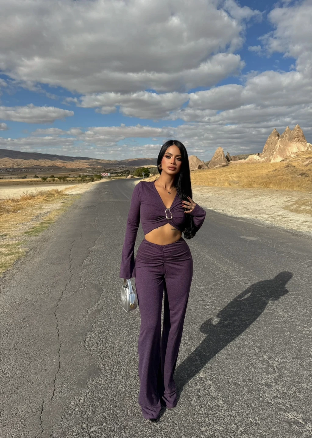 Mor Göğüs Tokalı Triko Takım