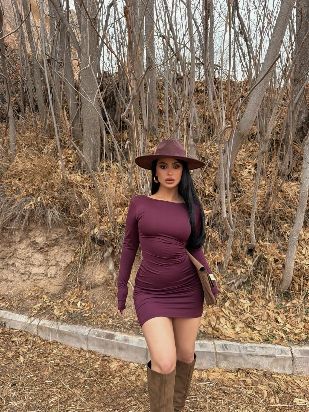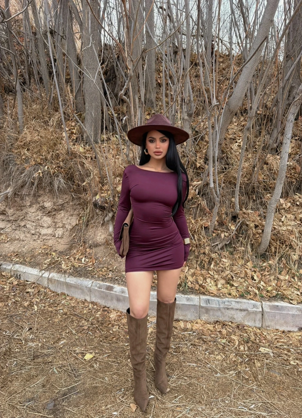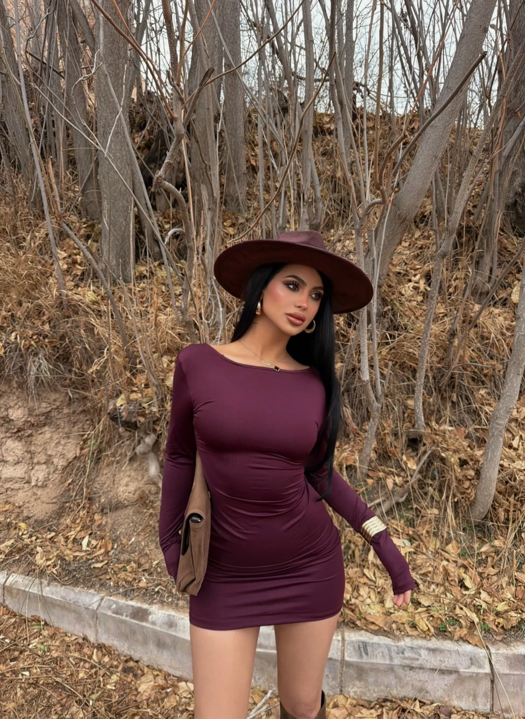 Mürdüm Sırt Açık Kayık Yaka Elbise
