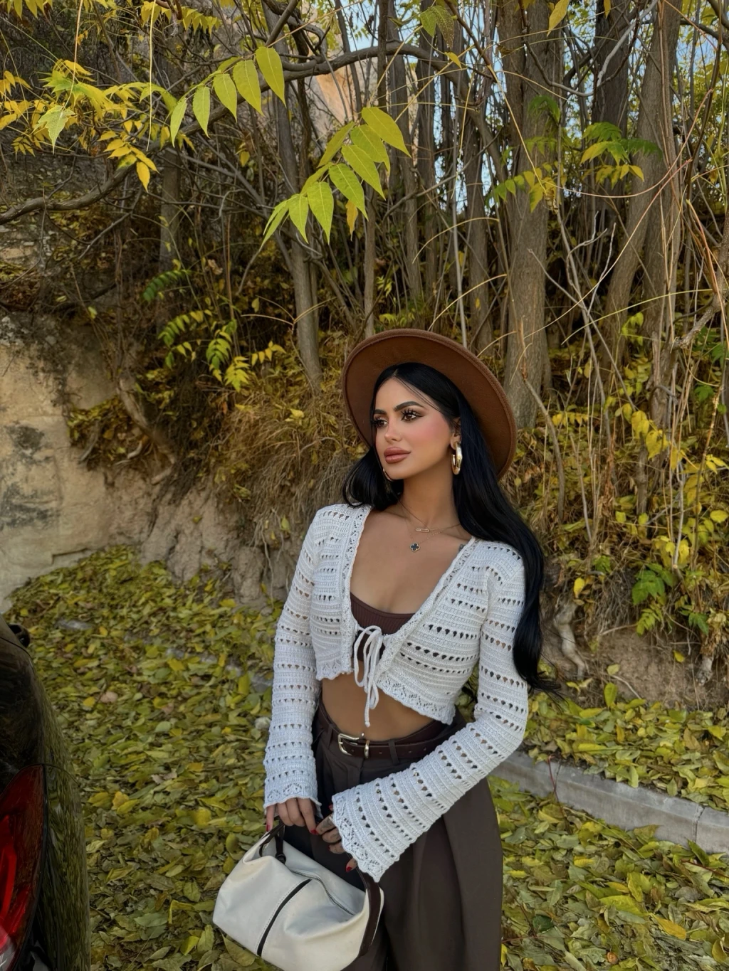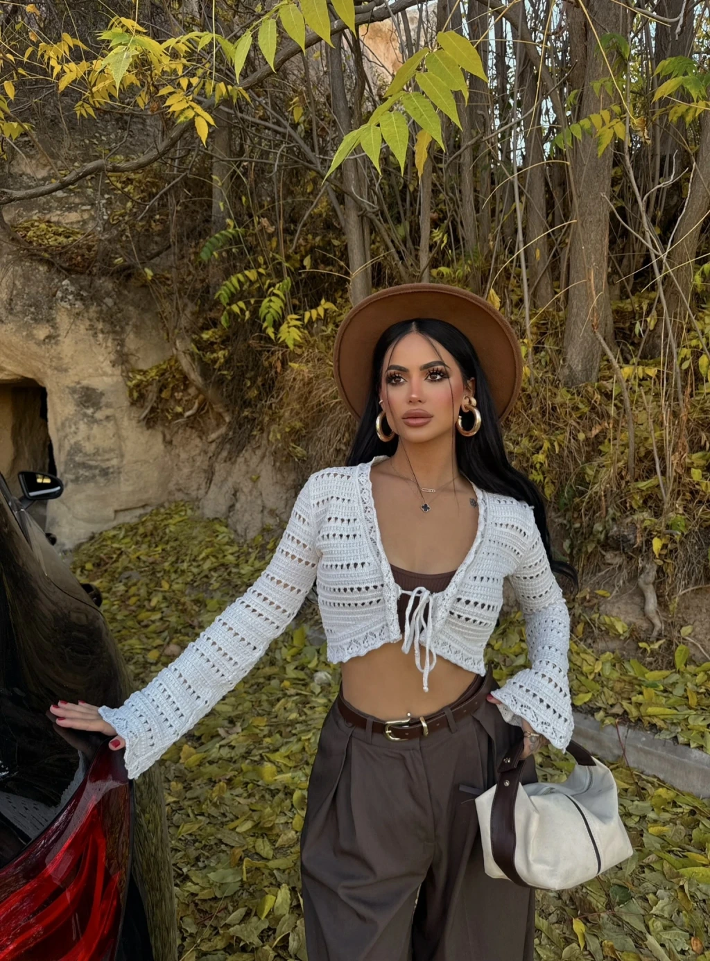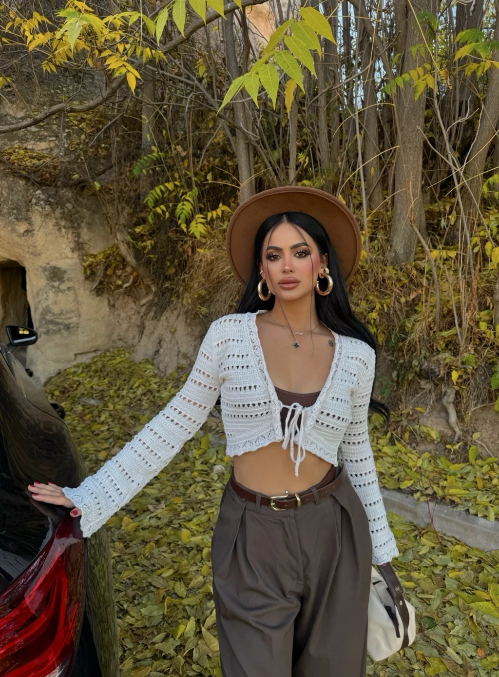 İnce işlemeli detayları ve ön bağcıklı tasarımı ile fark yaratan bu triko, hem şıklığı hem de rahatlığı bir arada sunuyor.