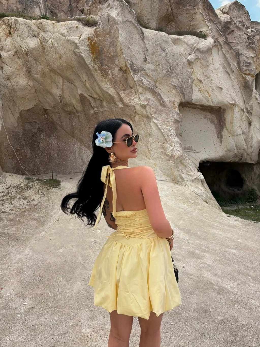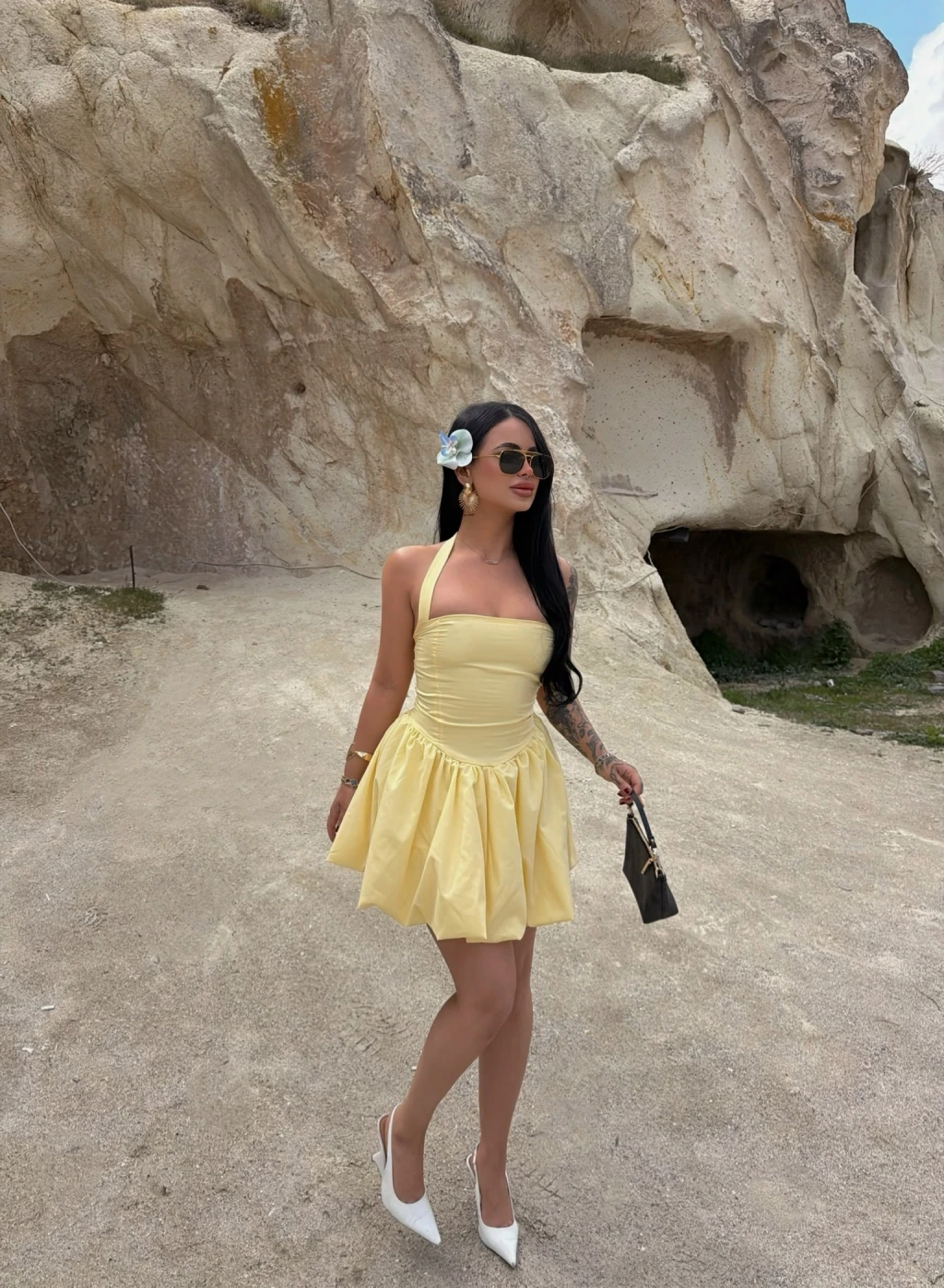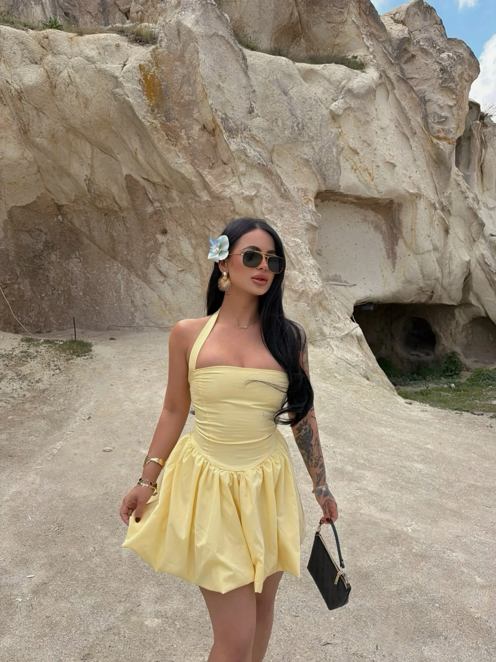 Sarı Boyundan Bağlamalı Balon Etekli Elbise